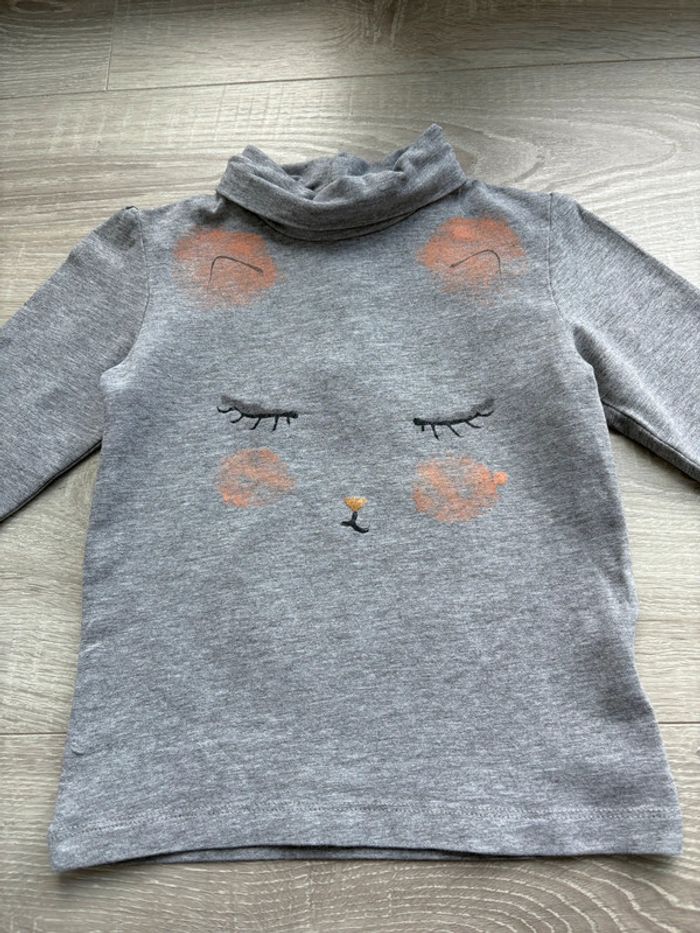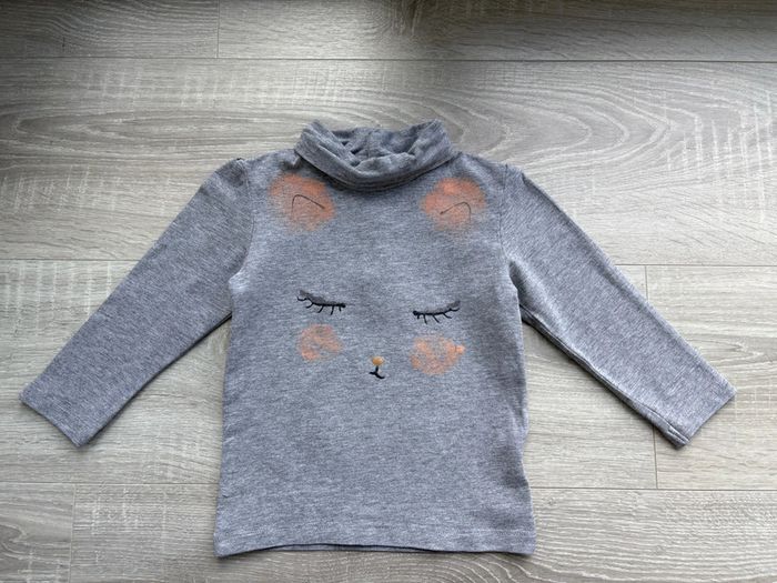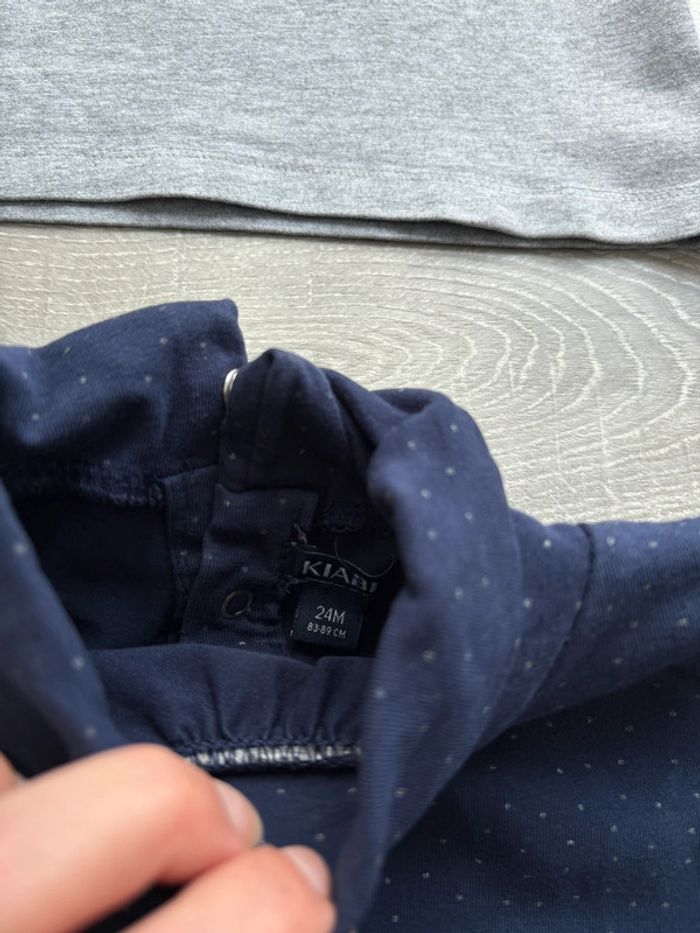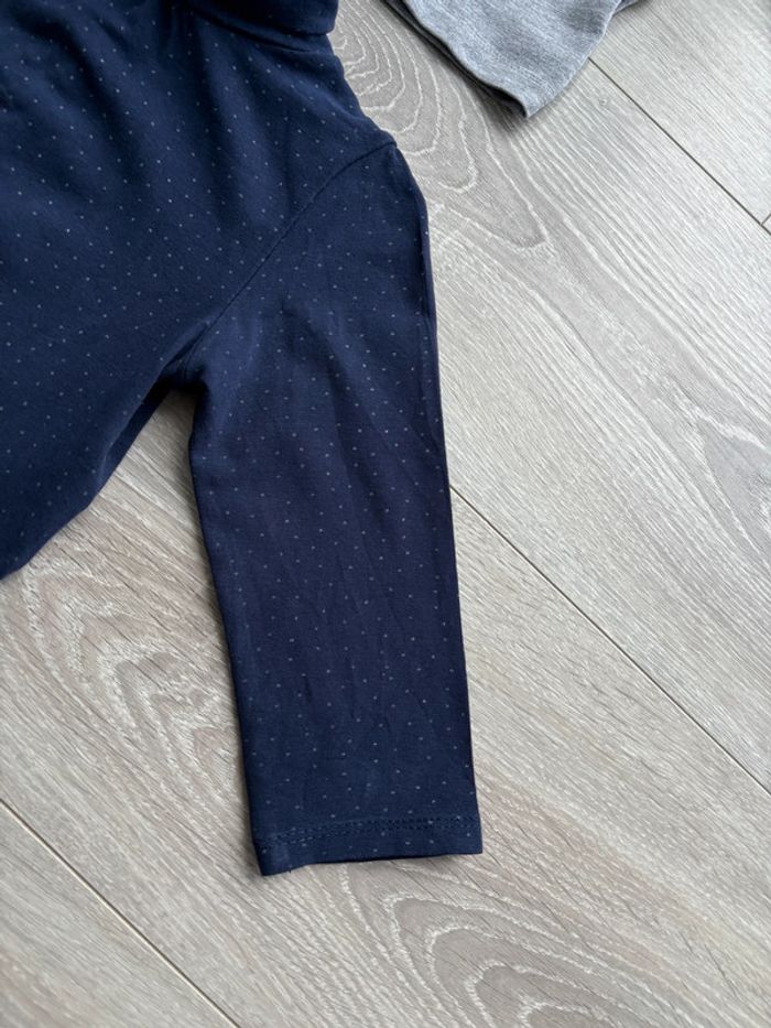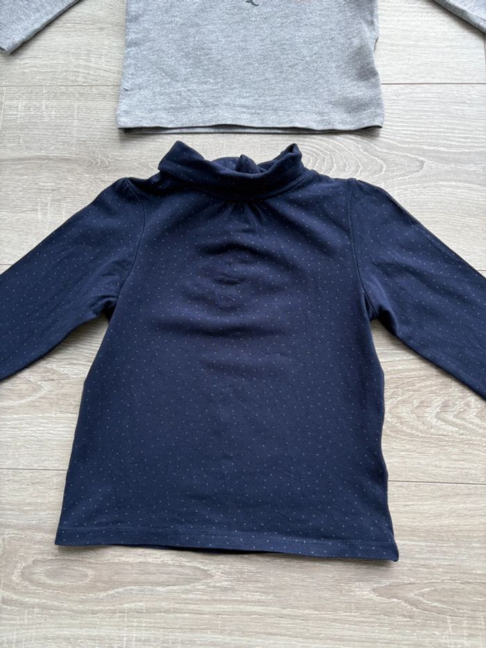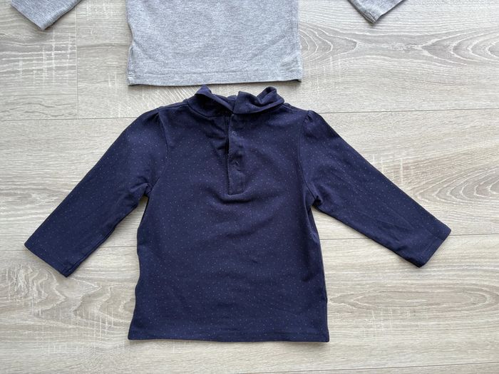 2 sous pulls de la marque Kiabi. Un sous pull bleu marine à pois gris décousu à l’arrière en bas (voir photo). Un gris comme neuf car très peu porté. Taille 24 mois. Je vends d’autre sous pulls dans mon dressing. Maison non fumeur et sans animaux.