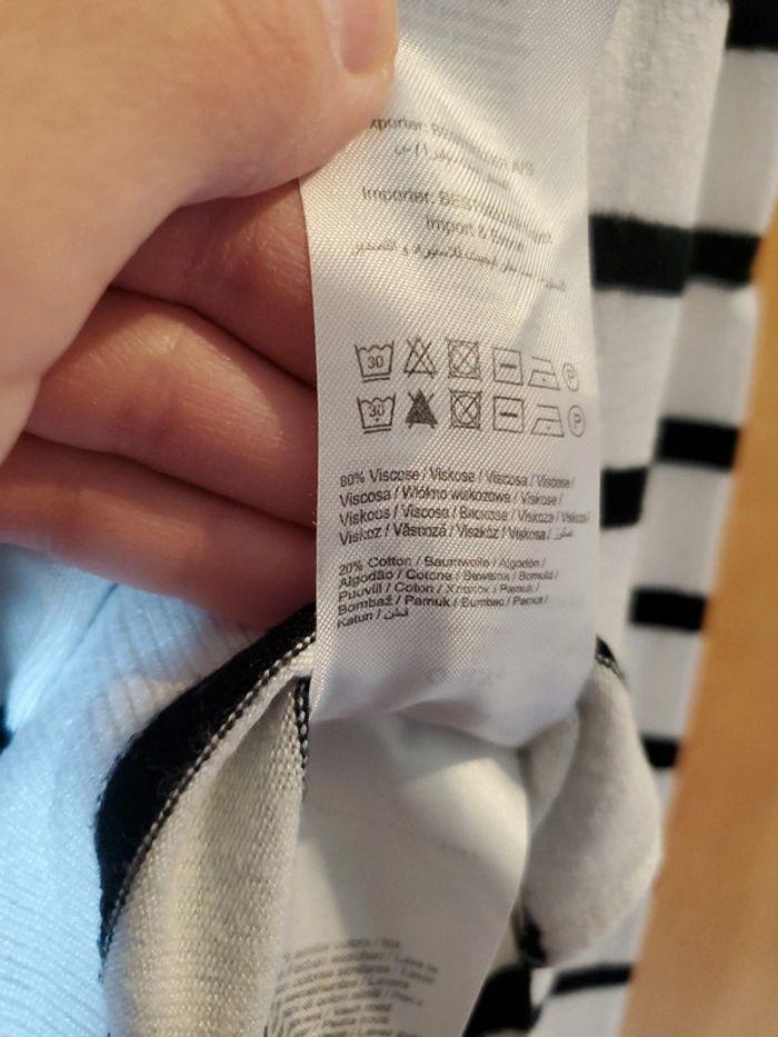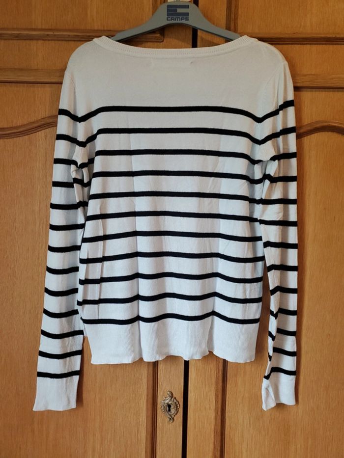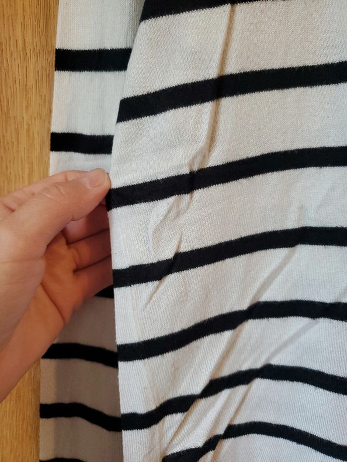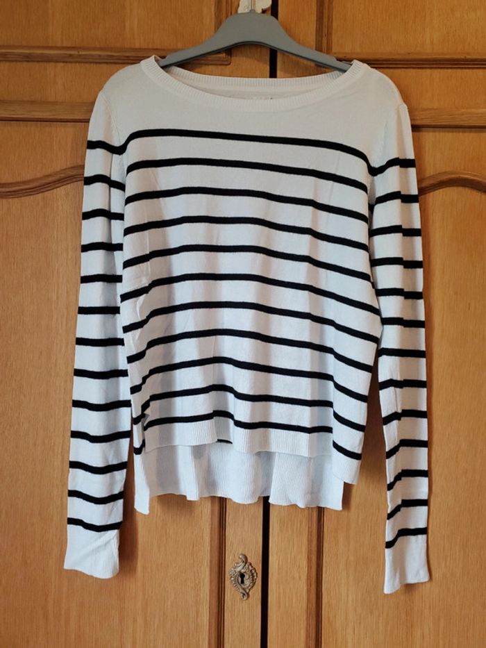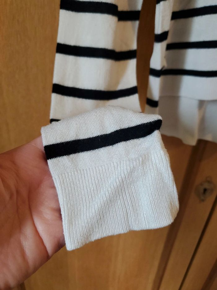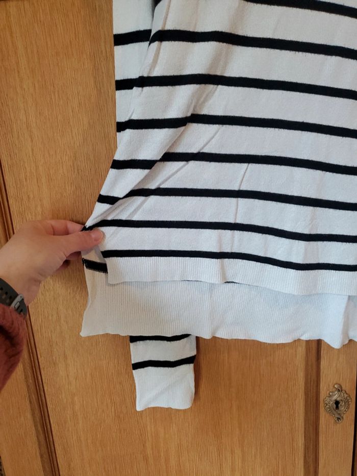 Pull fin blanc et noir, à rayures, plus court devant Présences de petites bouloches (très peu) ONLY / T.S Très bon état, car très peu portées (pas plus de 5 fois) #boulie2318taille36