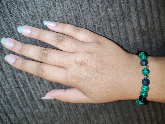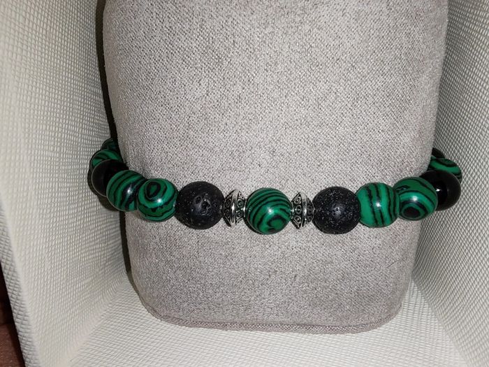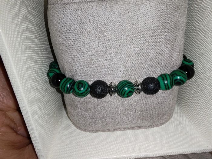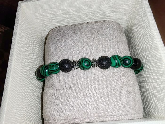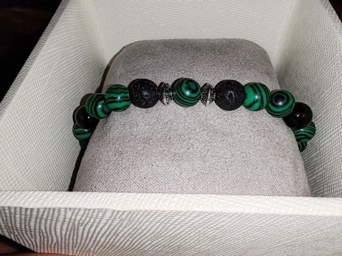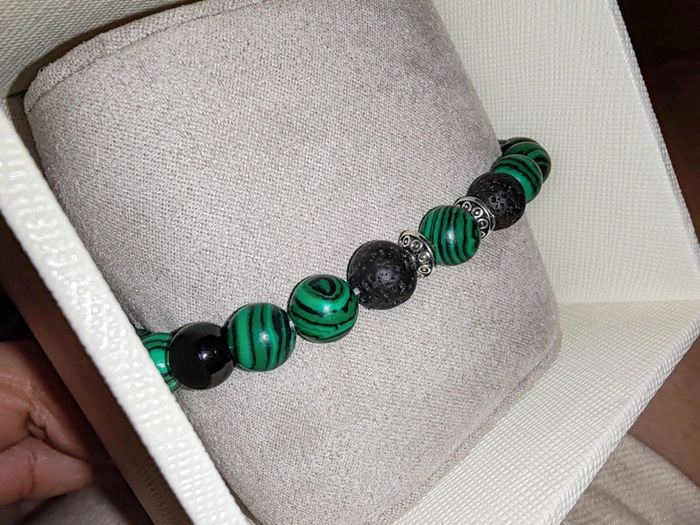 "Forêt Mystique" vous ancre à la terre avec ses pierres noires volcaniques et vous enveloppe de l'énergie de la nature avec ses perles aux reflets de malachite. Un bracelet puissant, à l'élégance brute et au charme organique. Parfait pour les esprits connectés à la nature, les amateurs d'énergie naturelle, ou pour un look audacieux. Pierres naturelles de malachite, d'agate noire et de lave volcanique ayant pour propriétés la protection, l'absorption des énergies négatives et la stabilité. Elles revitalisent le corps et l'esprit, augmentant la force et l'énergie physique. Vendu dans un pochon.