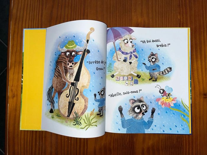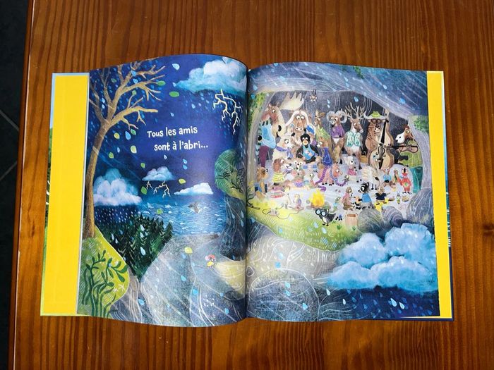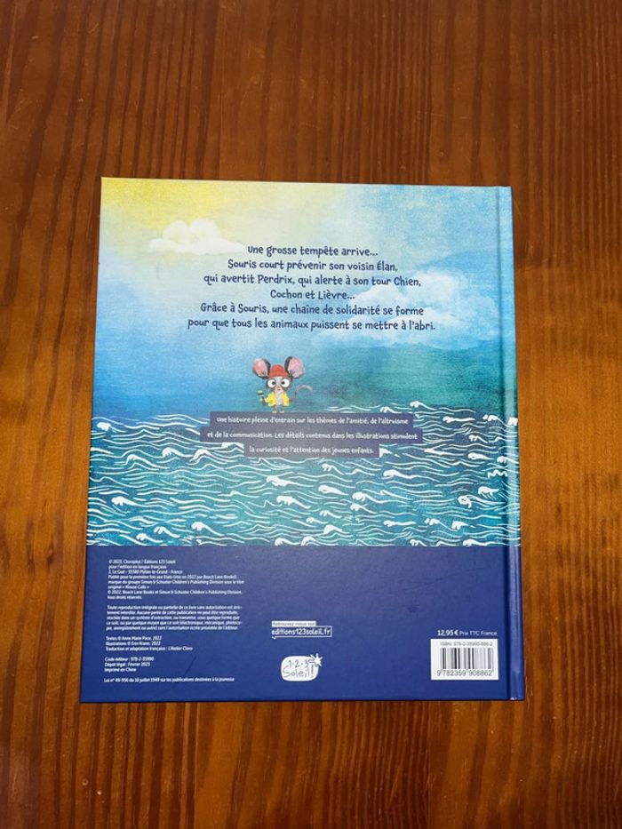 Pour enfants 0 à 3 ans Je vous propose ce livre neuf jamais lu ni manipulé sauf pour photos écrit par Anne-Marie Pace illustré par Erin kraan Merci de respecter mon prix. Je ne réponds pas aux offres. Bonjour élan, tu n’entends pas le vent une grosse tempête arrive vite perdrix. Voilà la pluie attention chien cochon et lièvre lièvre appelle chauve-souris qui va voir chat chat file chez crapaud puis se rend chez jument etc Pour finir, tous les amis sont à l’abri… Une grosse tempête arrive… Souris court prévenir son voisin Élan qui avertit Perdrix, qui alerte à son tour Chien, Cochon et Lièvre… C’est parti pour un jeu de téléphone arabe géant ! Grâce à Souris, une chaîne de solidarité se forme pour que tous les animaux puissent se mettre à l’abri. L’histoire, pleine d’entrain, met en avant les thèmes de l’amitié, de l’altruisme et de la communication. Les illustrations remplies de détail stimulent la curiosité et l’attention des jeunes lecteurs, qui seront ravis d’observer ce que chaque animal apporte dans la grotte pour partager avec les autres.
