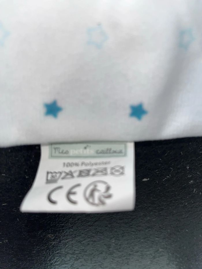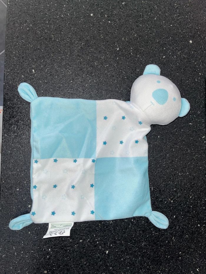 Le doudou ours/koala est neuf, jamais utilisé jamais lavé bleu clair bleu ciel, étoiles, trois nouettes, noeuds forme losange, carré, plat, style, mouchoir, tête peluche, visage imprimé