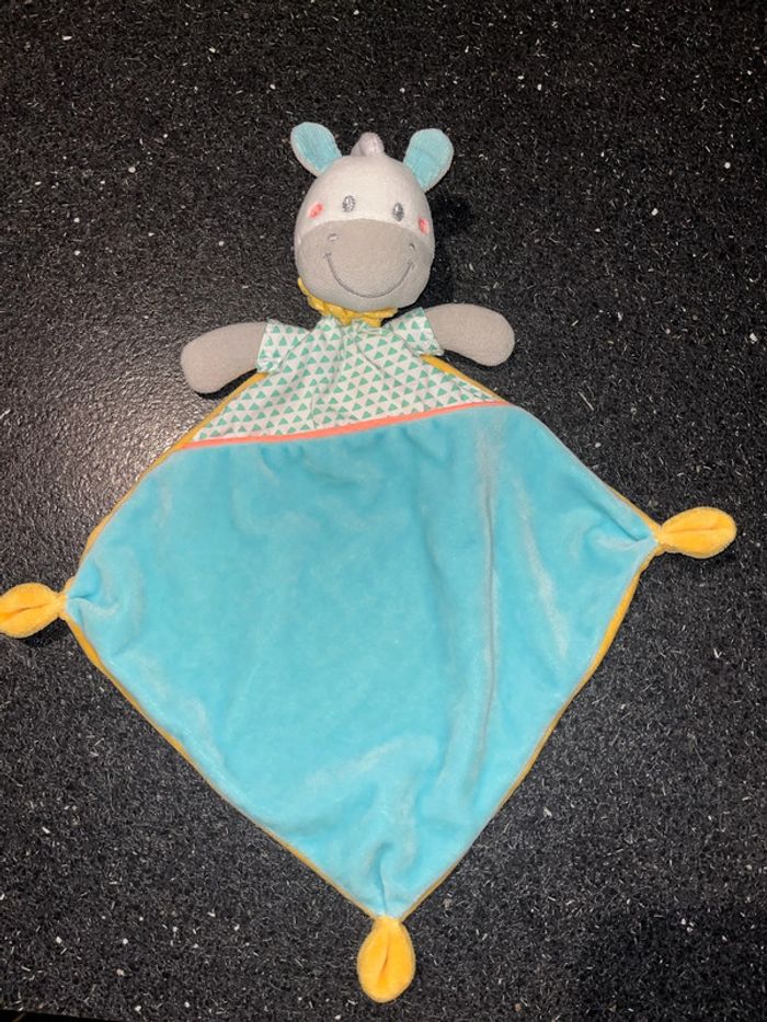 Réduction pour les lots. Pas de remise pour un seul article. Merci je vous propose ce doudou en très bon état. Tête peluche cheval 🐴 ou âne 🫏 ou poney , vache ou zèbre gris blanc bleu corps plat style mouchoir, velours jaune orange bleu ciel liseré rose, motif triangle vert, petit foulard autour du cou