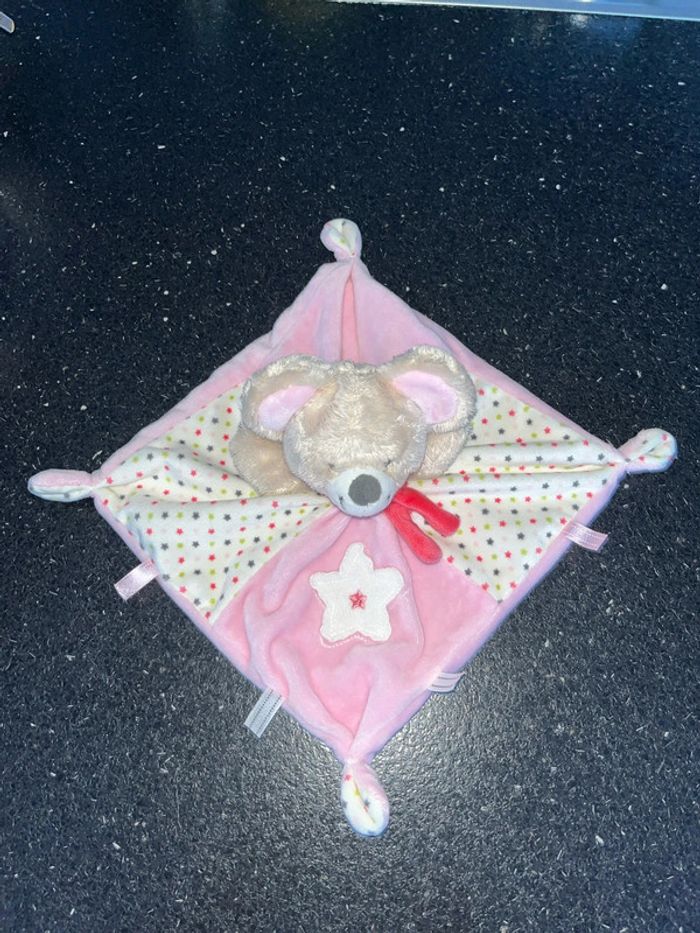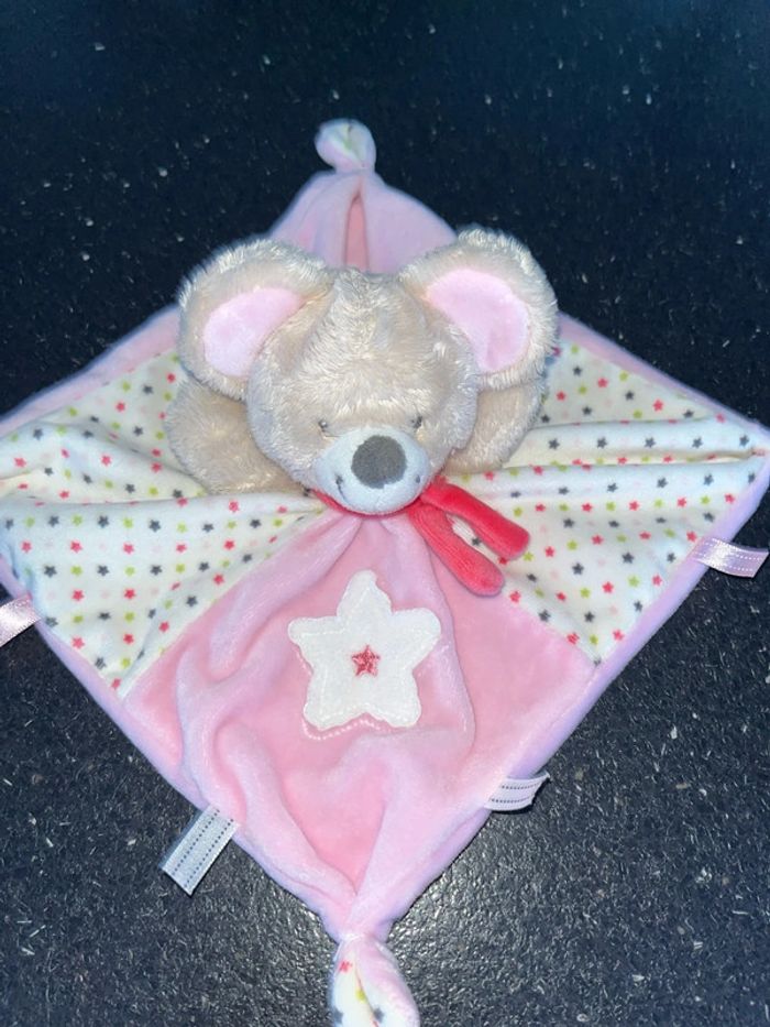 Réduction activée pour les lots pas de remise pour un seul article. Merci je vous propose ce doudou peluche tête souris beige, marron clair blanc gris rose écharpe autour du cou corps plat style mouchoir étoiles