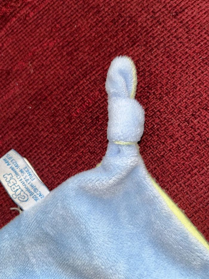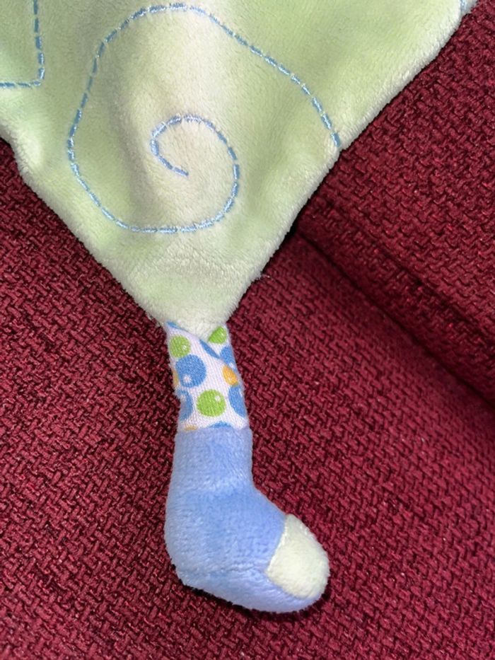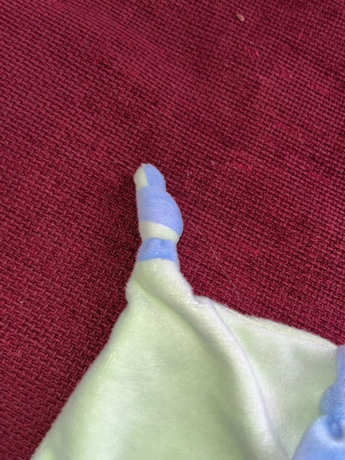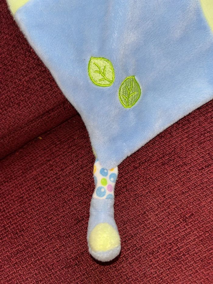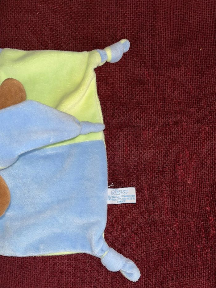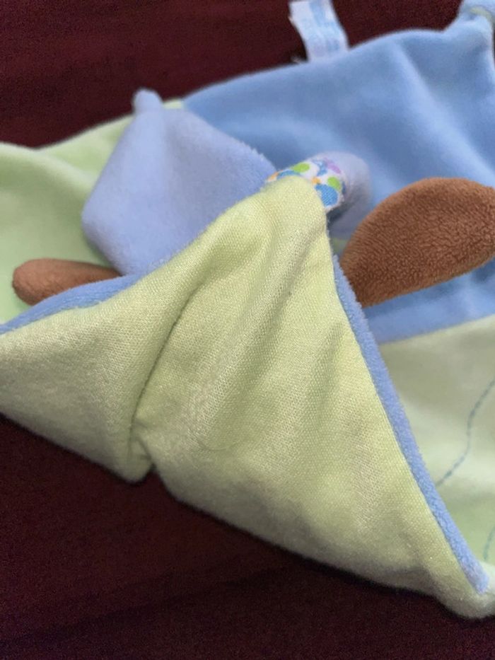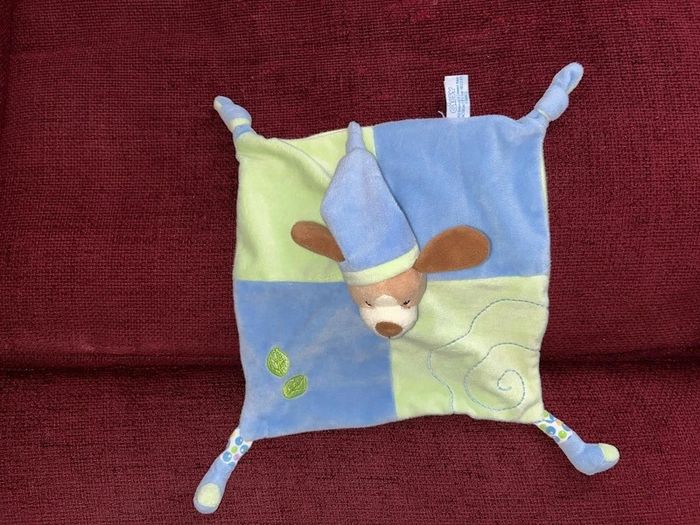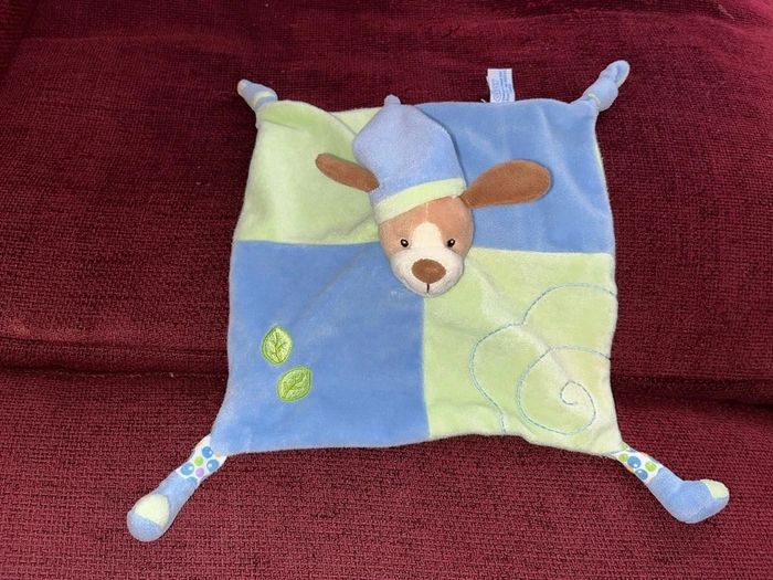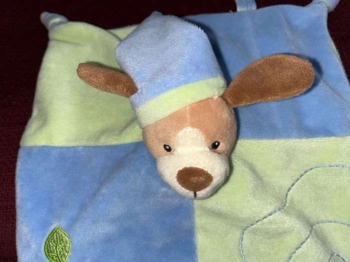 Réduction activée pour les lots prix non négociable pour un seul article Merci. de la marque Gipsy doudou plat style mouchoir tête peluche au centre chien marron clair beige, oreille chapeau avec un nœud pointu velours bleu vert, le corps et plat style mouchoir deux nœuds et 2 pieds velours Brodé feuille le dessous en tissu, petit trou en dessous de la tête pour mettre le doigt et faire marionnette