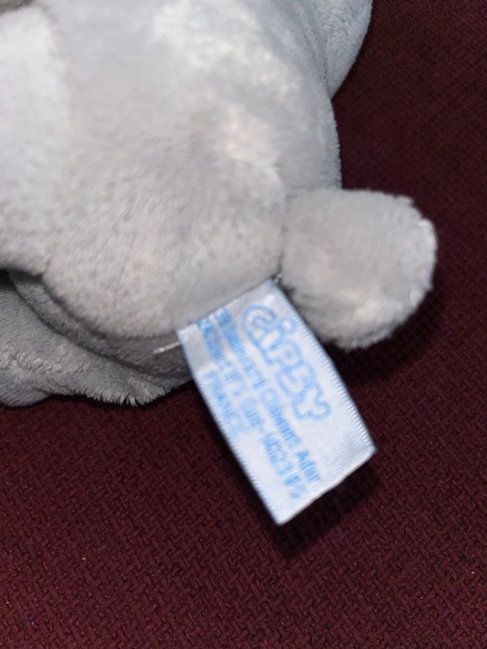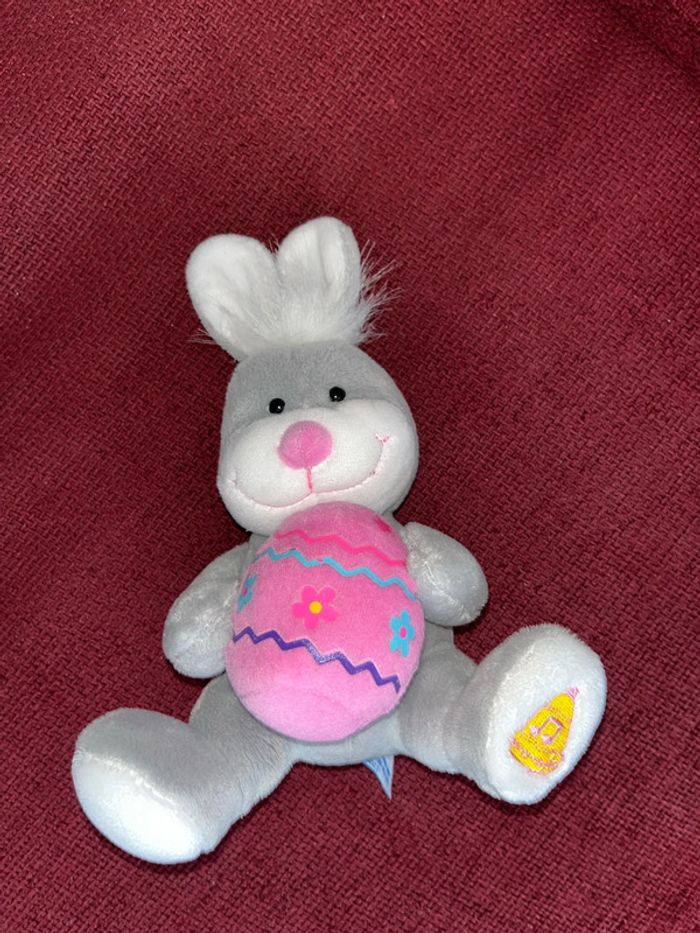 Prix non négociable, merci environ 18 cm de hauteur petit lapin, assis, velours gris blanc tenant son œuf de Pâques dans les bras rose bleu. Attention musique HS sinon excellent état marque Gipsy (À la base peluche musicale )