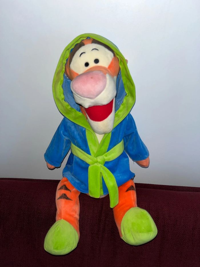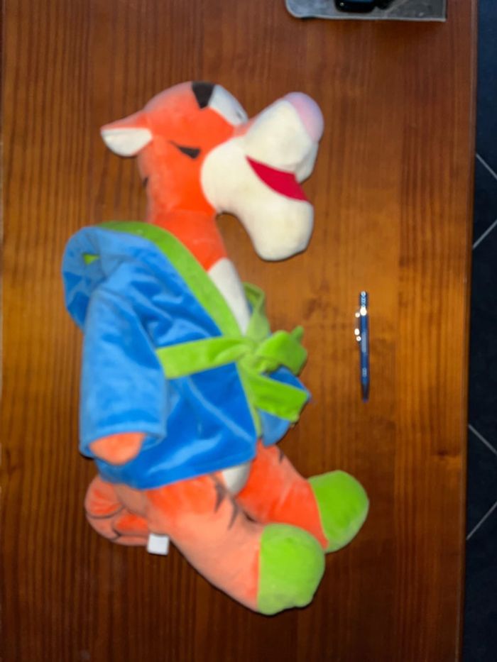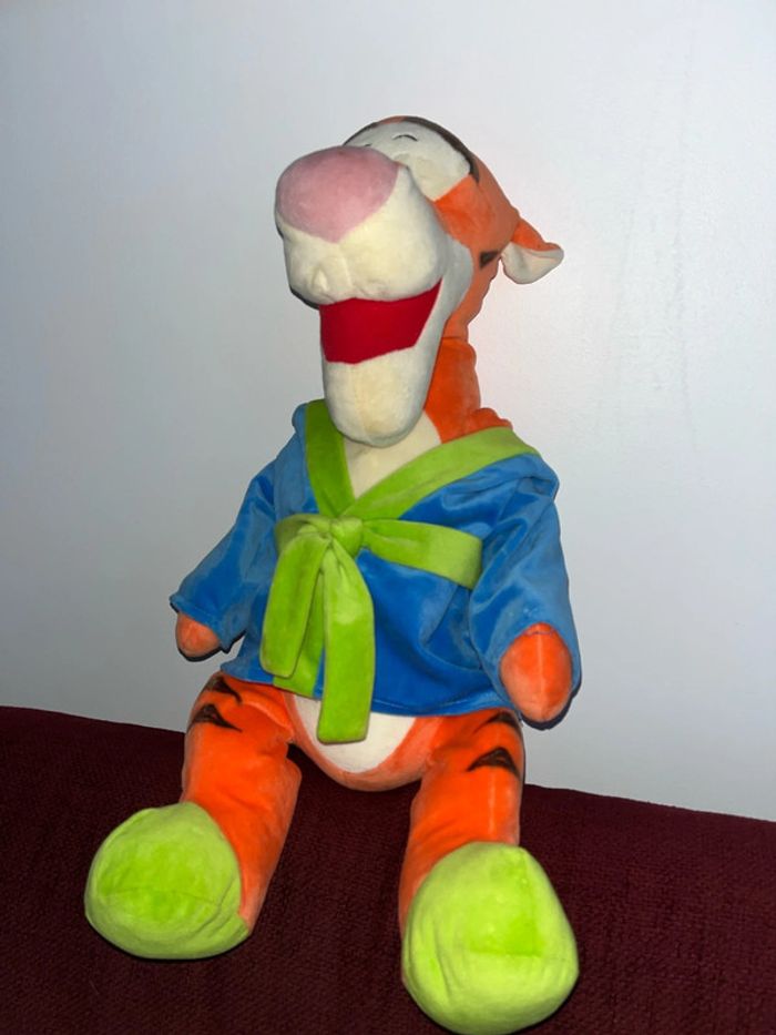 Réduction activée pour les lots, 10 % de réduction à partir de trois articles achetés dans mon dressing, beaucoup de livres enfants de jouets. Je vous propose cette grande peluche 50 cm environ. Assis Tigrou tigre ami de Winnie, l’ourson avec son vêtement bleu vert ceinture excellent état. Il sera passé en machine avant l’envoi car je m’aperçois d’une petite tâche sur le nez