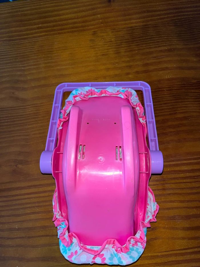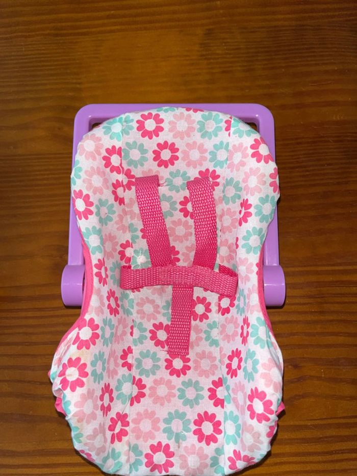 Pour un petit bébé de 20 cm environ. Je vous propose ce porte-bébé en plastique rose violet avec sa housse amovible motif fleurs.