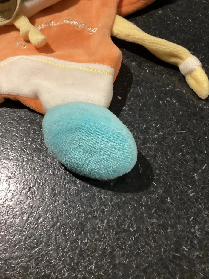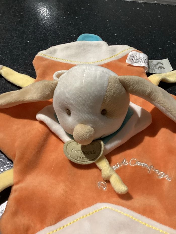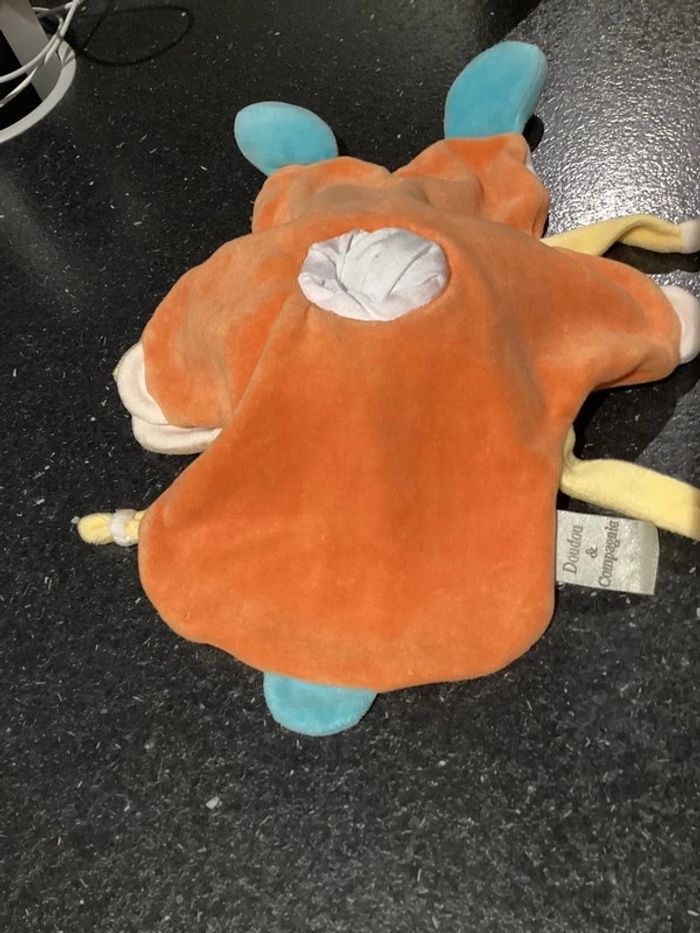 Prénom négociable. Merci je vous propose ce doudou vintage, couleur orange blanc beige, crèmes marron clair bleu jaune marionnette Très bon état, juste petite usure au niveau d’un pied voir photo