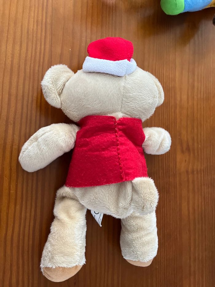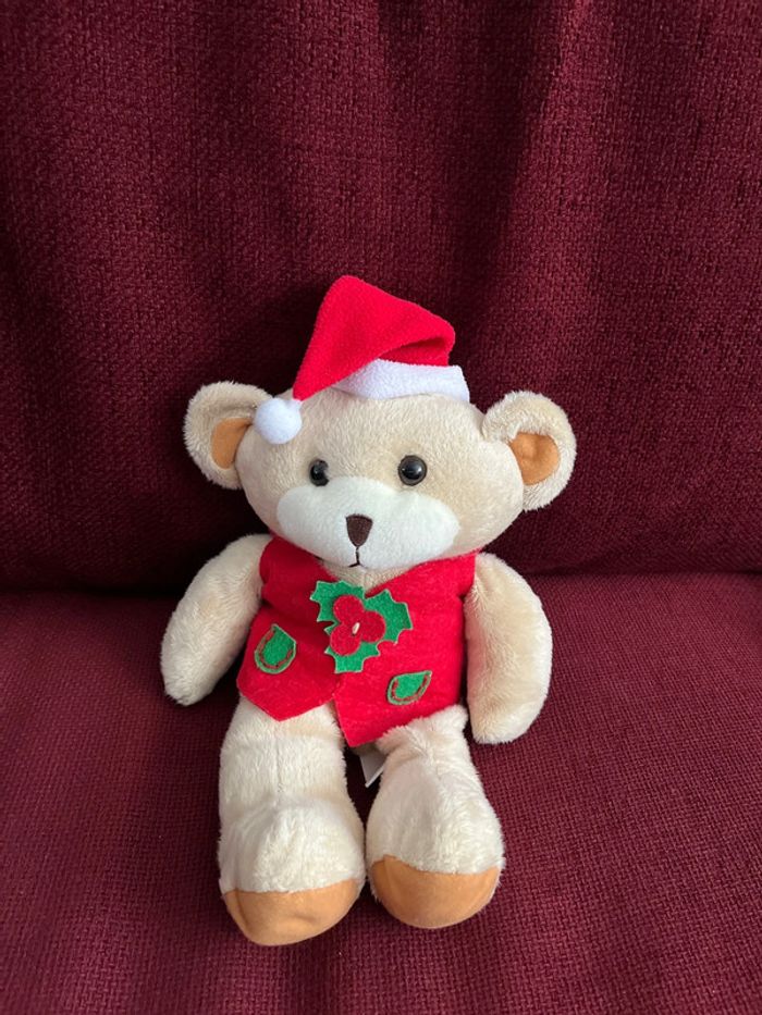 Je vous propose cet peluche doudou ours habillé gilet veste velours beige, marron rouge vert bonnet Noël 🎅 feuille houx Nederland