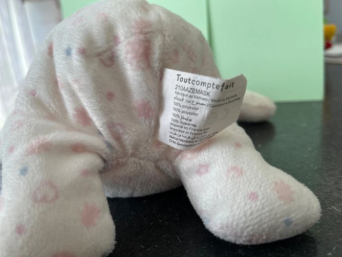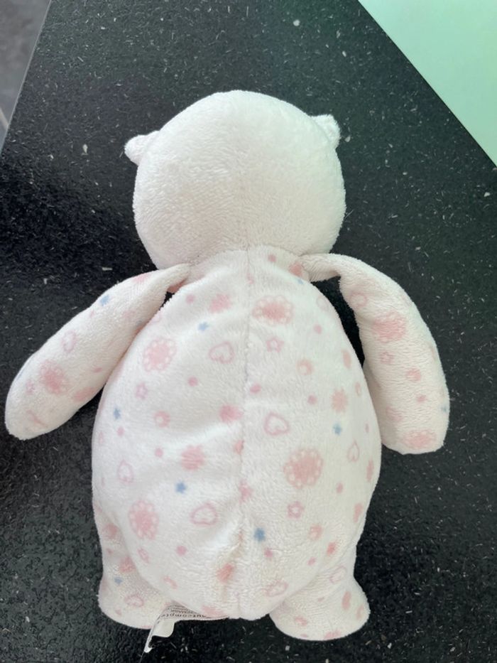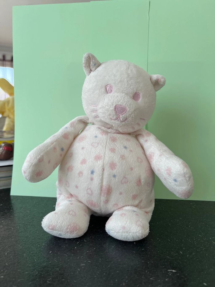 Hauteur totale, debout, environ 25 cm en très bon état, peluche, chat ou bien ours Doudou en velours blanc microbilles dans les fesses, imprimé motif cœur rose, fleurs étoile bleu le visage est brodé parfait pour les petites mains de bébé