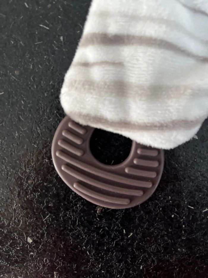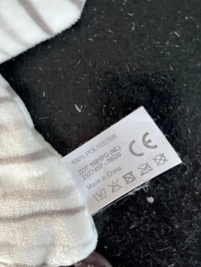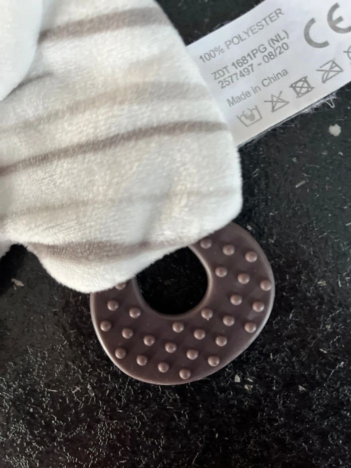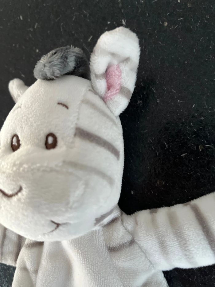 Petit doudou, tête, peluche, zèbre, velours gris blanc, deux anneaux de dentition état neuf corps plat action Bruit de papier froissé au niveau du ventre étiquettes, marque présente