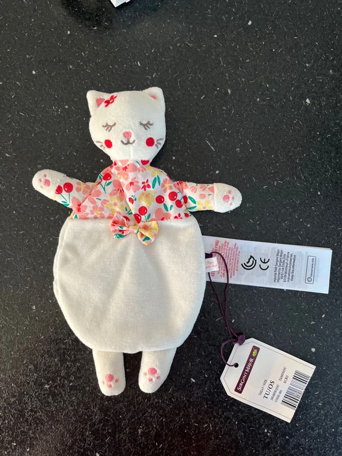 Prix non négociable, merci réduction activée pour les lots. Je vous propose ce petit doudou plat Tête peluche avec grelot hochet hauteur environ environ 23 cm. Velours blanc brodé empreinte rose pommettes rouges, les yeux, les moustaches brodé gris, (style vêtement) tissu rose, cerise jaune, petit nœud et fleur sur la tête.