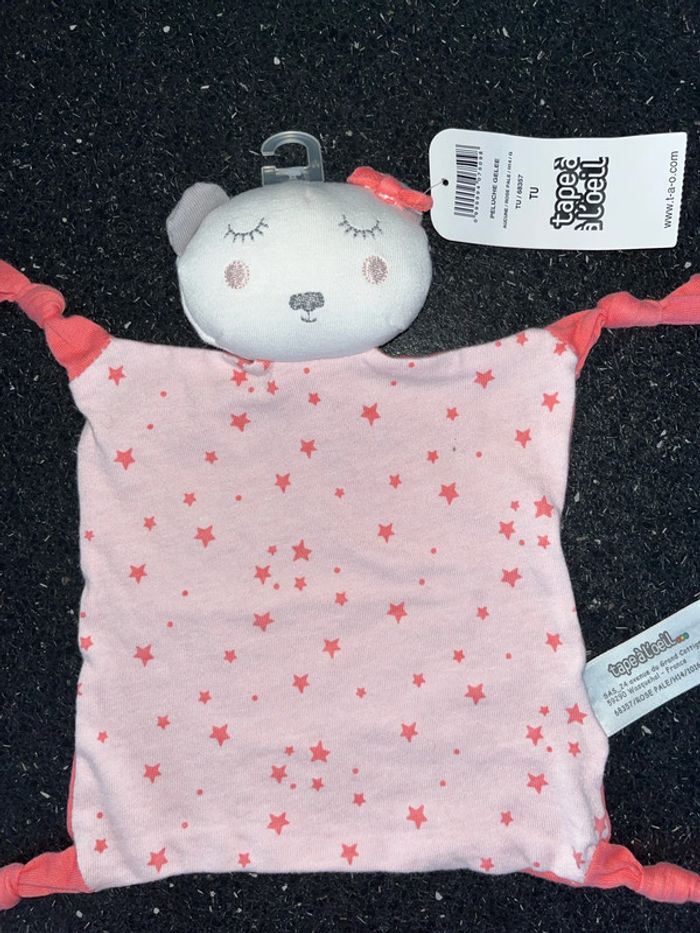 Article neuf Prix non négociable, merci réduction activée pour les lots. Je vous propose ce doudou plat tissu jersey rose étoile, imprimé, quatre nœuds tête peluche oreille grise. Les yeux sont fermés, les pommettes brodées petits nœuds sur la tête.