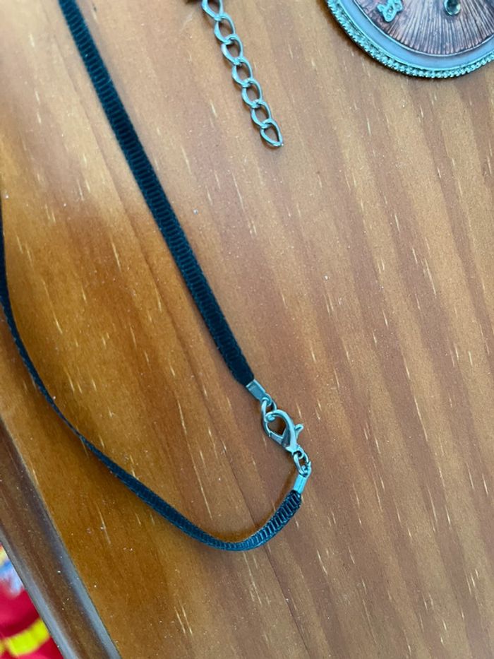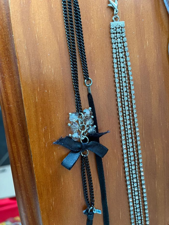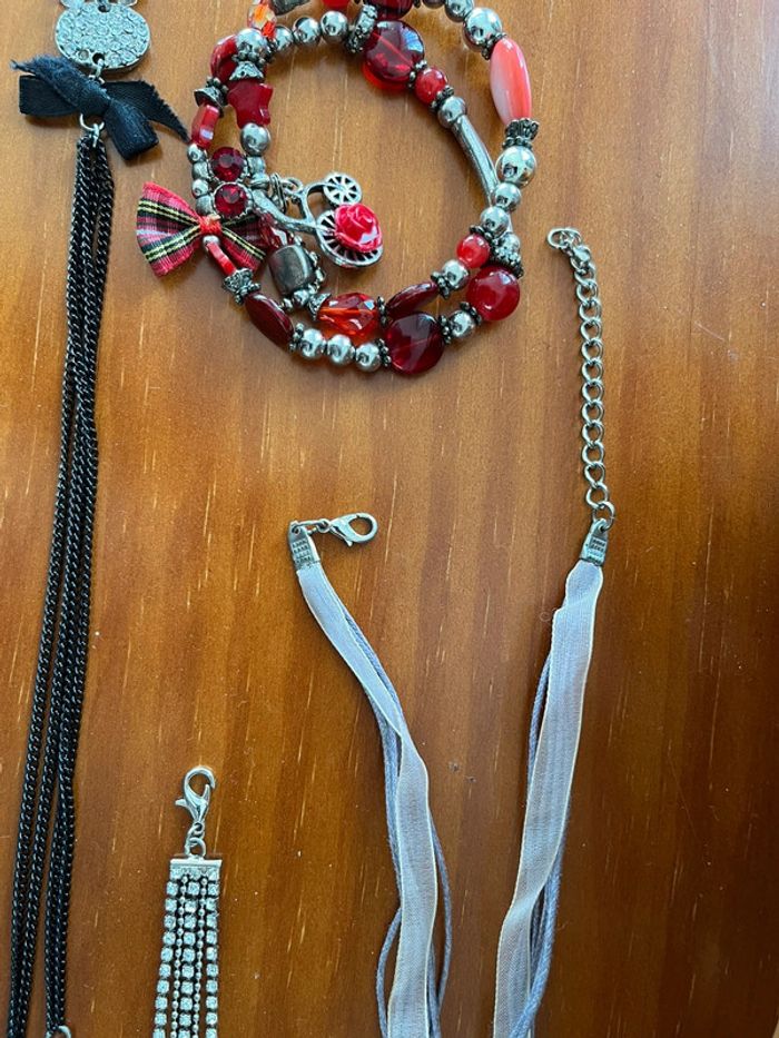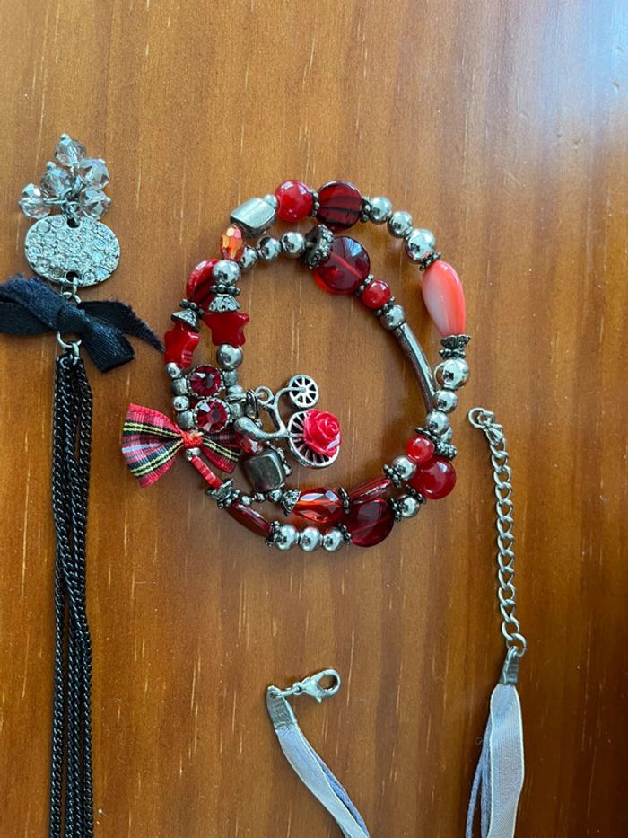Prix fixe, merci Je vous propose ce lot en prenant un bracelet argenté, un autre bracelet élastique, coloris, argent, rouge, grenat, petits nœuds en tissu, un collier avec médaillon dans les tons roses et un autre collier noir argent à signaler petite réparation voir photo