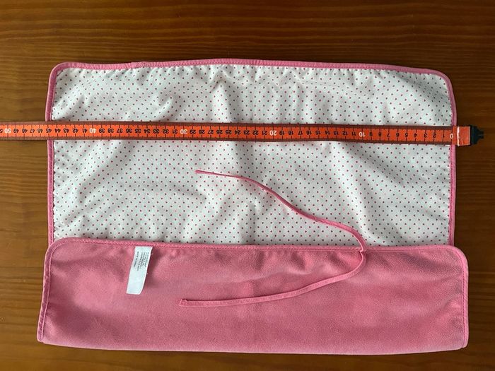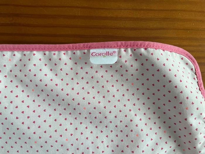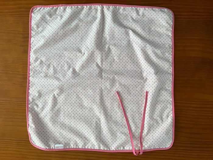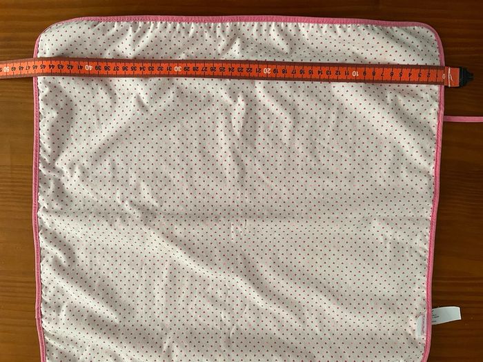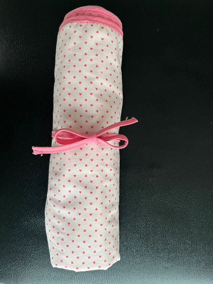 Les dimensions sont de 45 cm sur 45 environ. Un côté velours rose, un côté tissu blanc beige, imprimé cœur, 2014.
