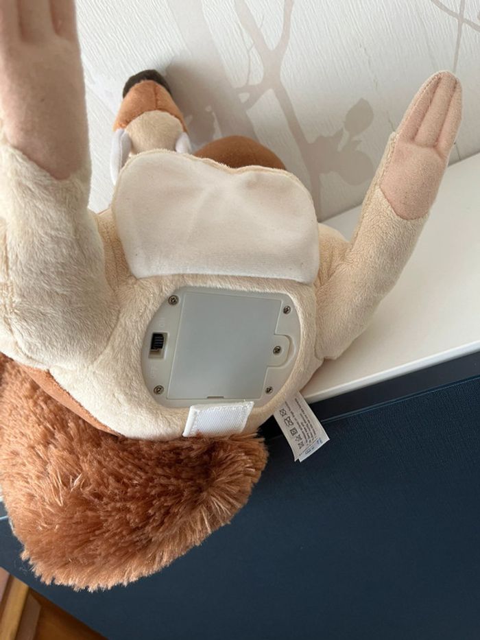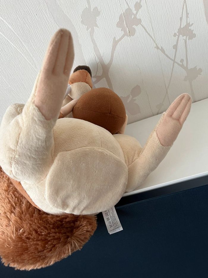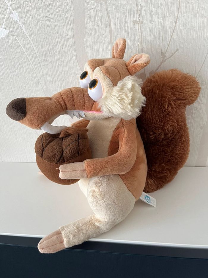 Peluche animée sonore L’Écureuil scrat un peu fou et très malchanceux rongeur gaffeur Bouge les yeux Fait des bruits Il crie si tu essaies de prendre (sa noisette ) son gland Les piles sont fournies Hauteur 25 cm environ Gipsy