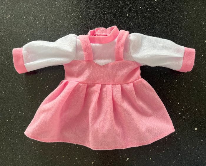 Pour une poupée d’environ 36 cm, jolie robe rose blanc, fermeture scratch dans le dos. Très bon état. Vêtement