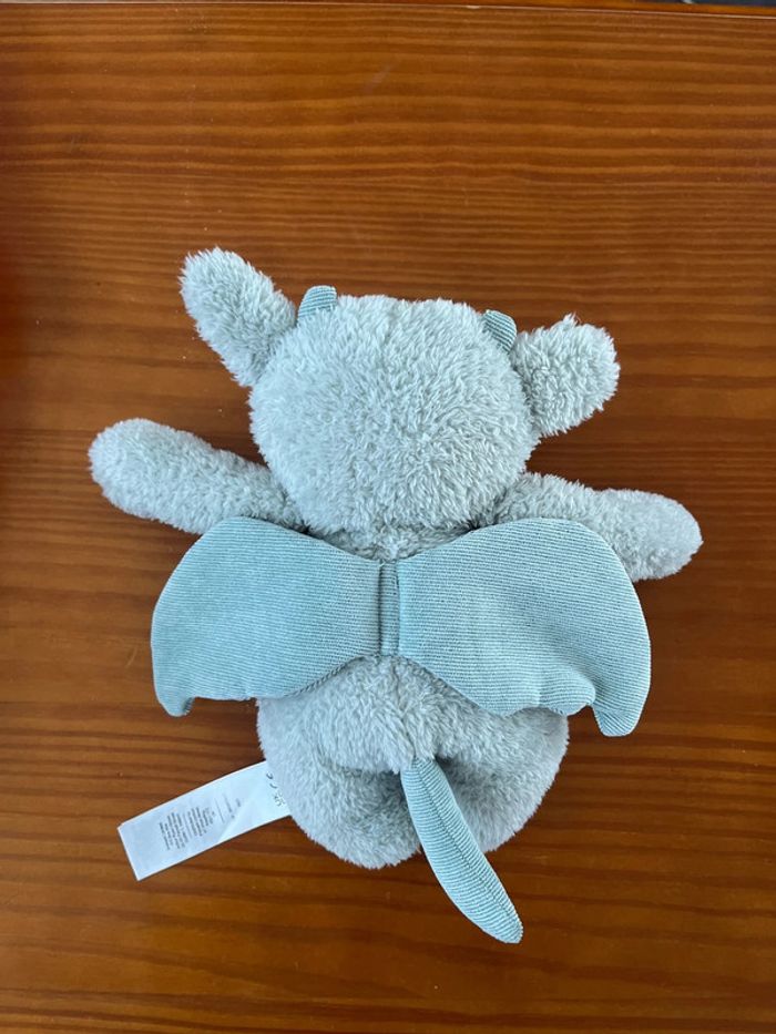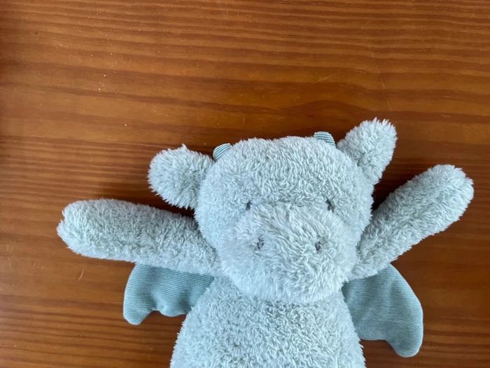 Doudou, une bonne vingtaine de centimètres de hauteur représentant une vache, un ange avec des ailes dans le dos couleur vert