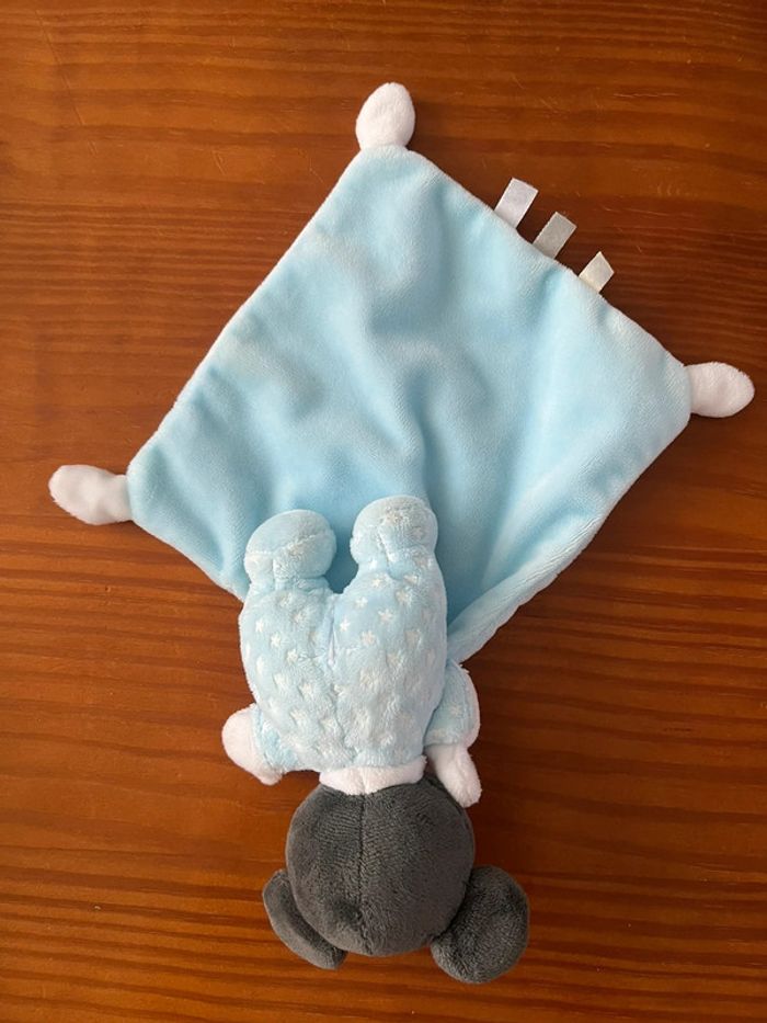 État nickel, sans étiquette petite peluche Mickey, avec son pyjama, bleu étoile blanche, tenant son doudou mouchoir à la main. Hello star, chien lune