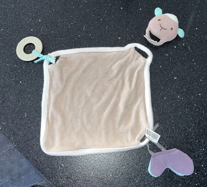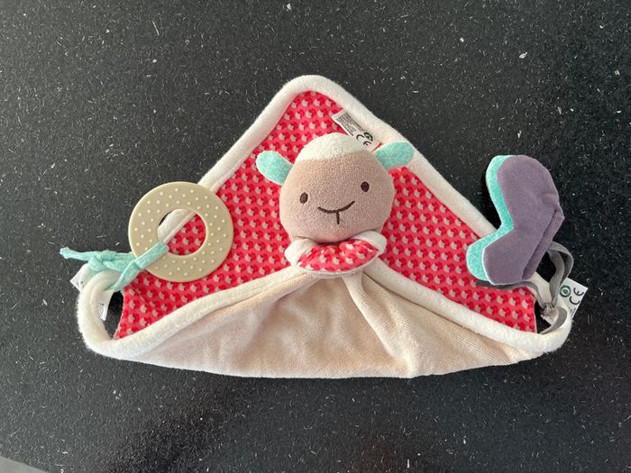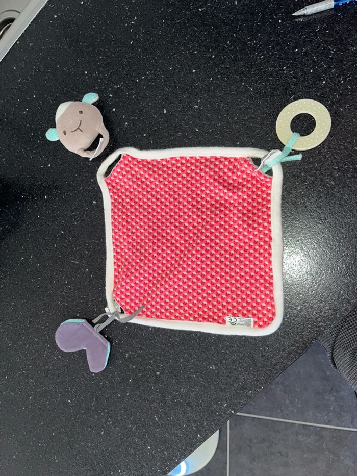Tête, peluche, corps, plat, style mouchoir avec anneau dentition et petit papillon bruit de papier froissé, couleur blanc, beige bleu rouge Tous les éléments peuvent se détacher la tête, le corps, le papillon, l’anneau dentition pour le lavage ça peut être pratique