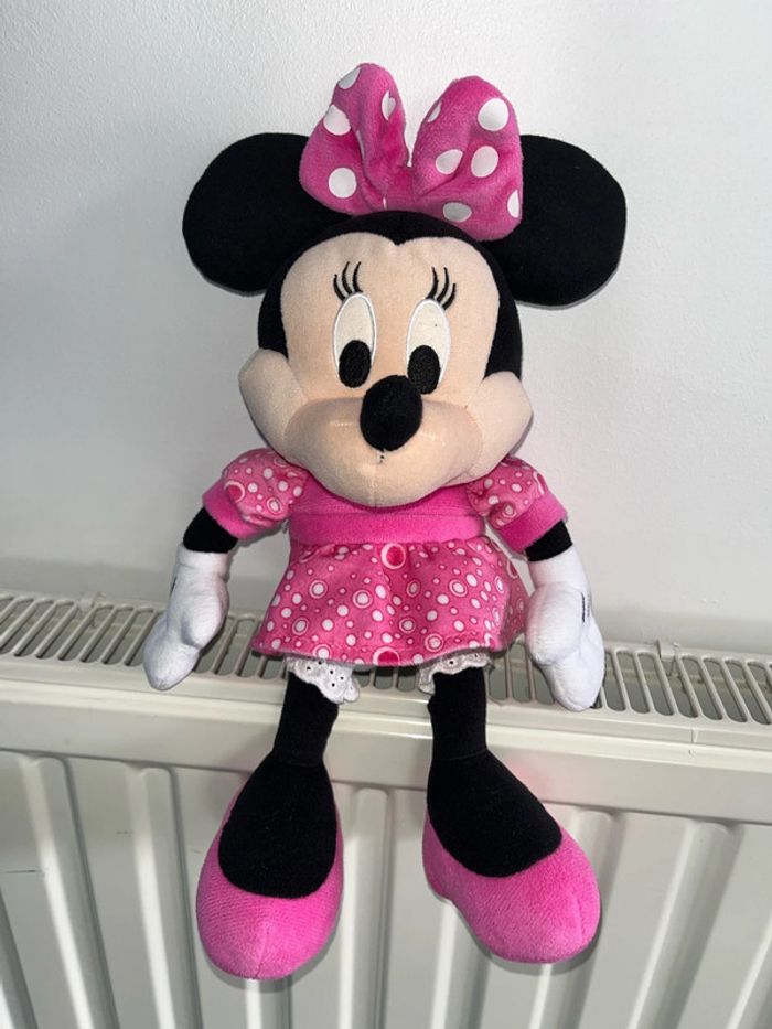 Environ 32 cm Happy Sounds Disney Elle rit - rigole Elle éternue Les piles sont fournies Très bon état La peluche peut être lavée, système sonore qui s’enlève À partir de 18 mois Bébé va adorer la serrer contre lui pour entendre son rire communicatif Minnie amoureuse de Mickey