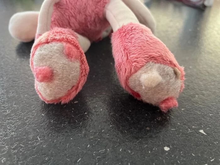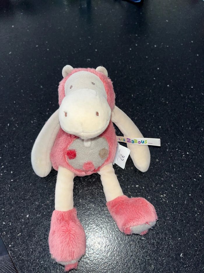 Environ 23 cm de hauteur, peluche hippopotame, collection les zazous Moulin roty 2015 velours beige, écru, fourrure, rose, ventre gris. Excellent état non utilisé.