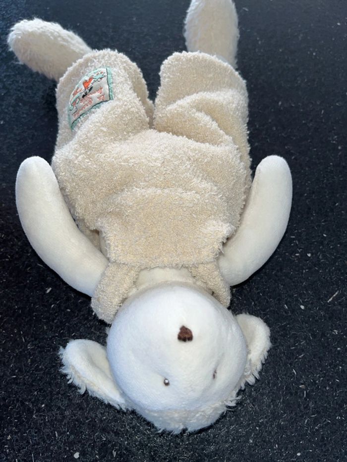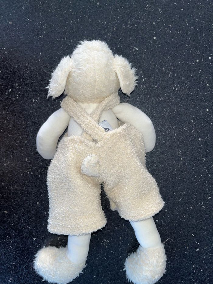 Agneau 🐑 30 cm environ de hauteur en velours blanc, fourrure, beige, salopette, vêtement qui peut s’enlever