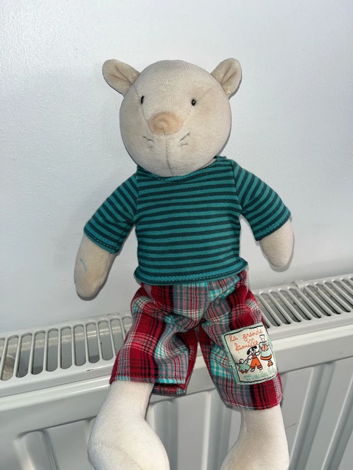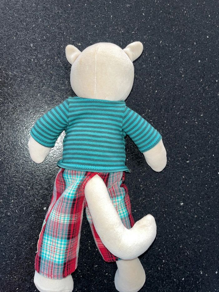 Environ 32 cm de hauteur pour cette peluche doudou chat, velours, écru, beige, polo, rayé vert, pantalon carreaux rouge, la grande famille A signaler. petite trace sur la tête à l’arrière voir photo. Les vêtements peuvent s’enlever.
