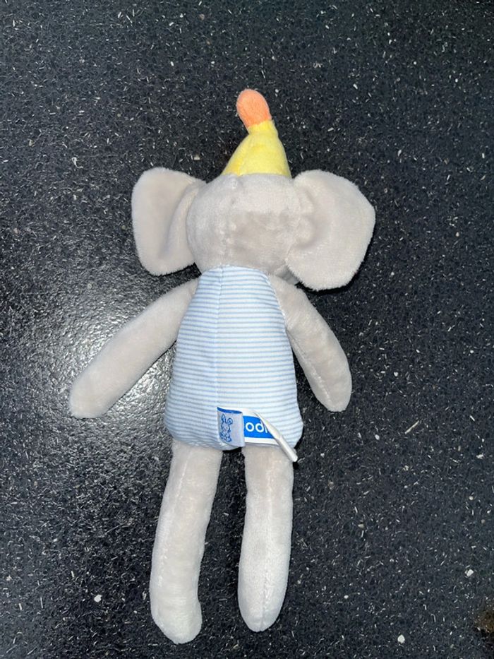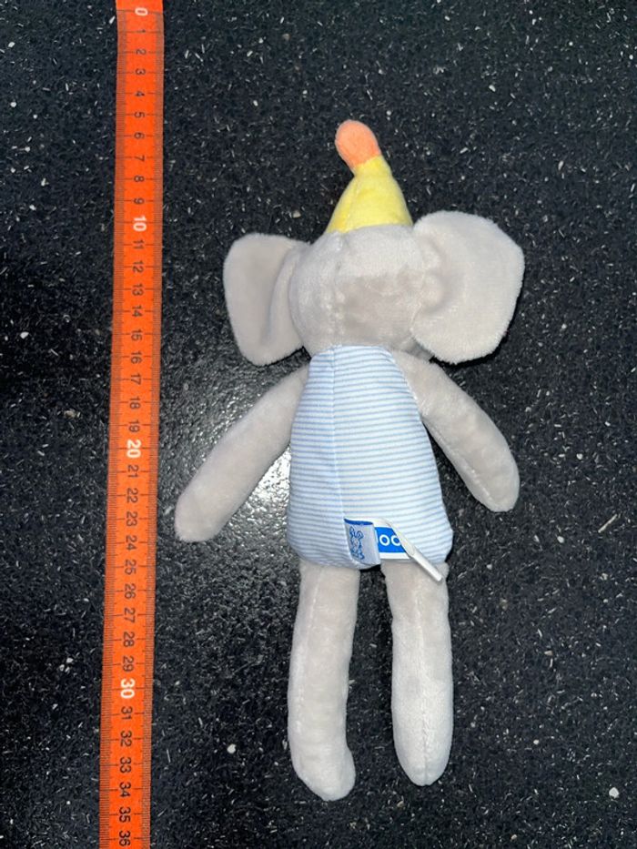 Environ 28 cm de hauteur petit éléphant avec chapeau jaune orange. Le corps et blanc rayé bleu brodé dodie Les membres sont en velours gris ainsi que la tête, l’intérieur des oreilles blanc Pois orange jaune bleu vert, excellent état pour cet objet qui n’a jamais été utilisé laboratoires Po (Hygiene et & soin Coffret eau de senteur)