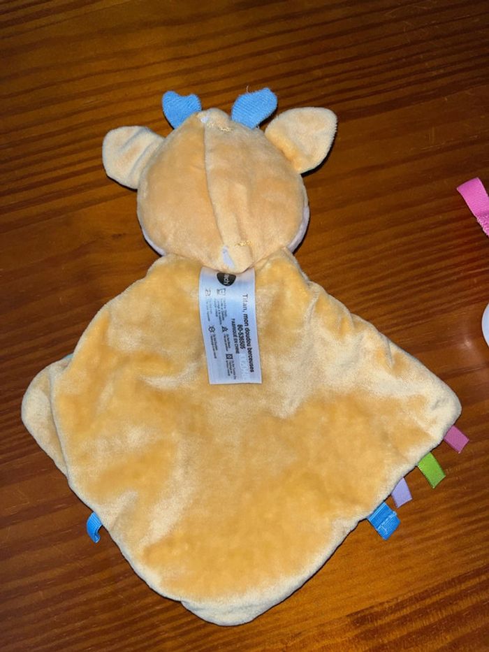 Petit système dans la tête qui peut bien sûr s’enlever pour laver le doudou facilement couleur marron bleu, vert, orange rose attache tétine cœur les yeux sont fermés, il dort biche, style mouchoir, ruban VTech