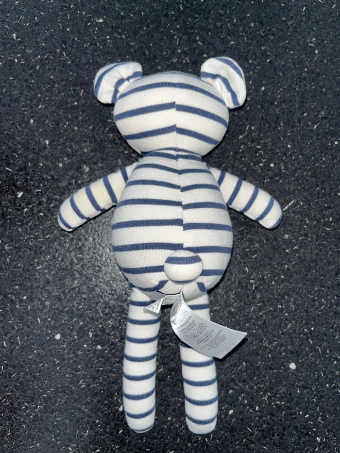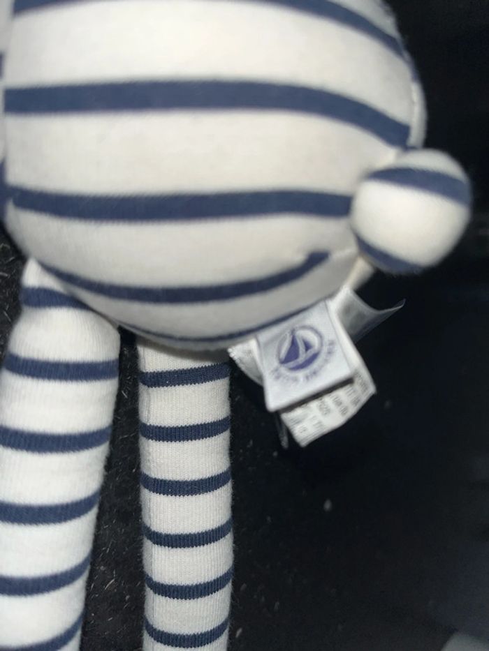 25 cm environ de hauteur, peluche, doudou ours, rayé bleu blanc. Les yeux sont brodé rouge, imprimé petit bateau sur le devant À signaler voir photo sur le derrière de la peluche trace au niveau d’un membre, une patte