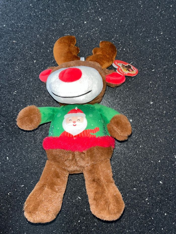 Prix non négociable merci je vous propose cette peluche d’environ 30 cm de hauteur neuve encore avec étiquette reine de Noël tout doux, avec son nez rouge Imprimé Père Noël sur son faux pull velours vert