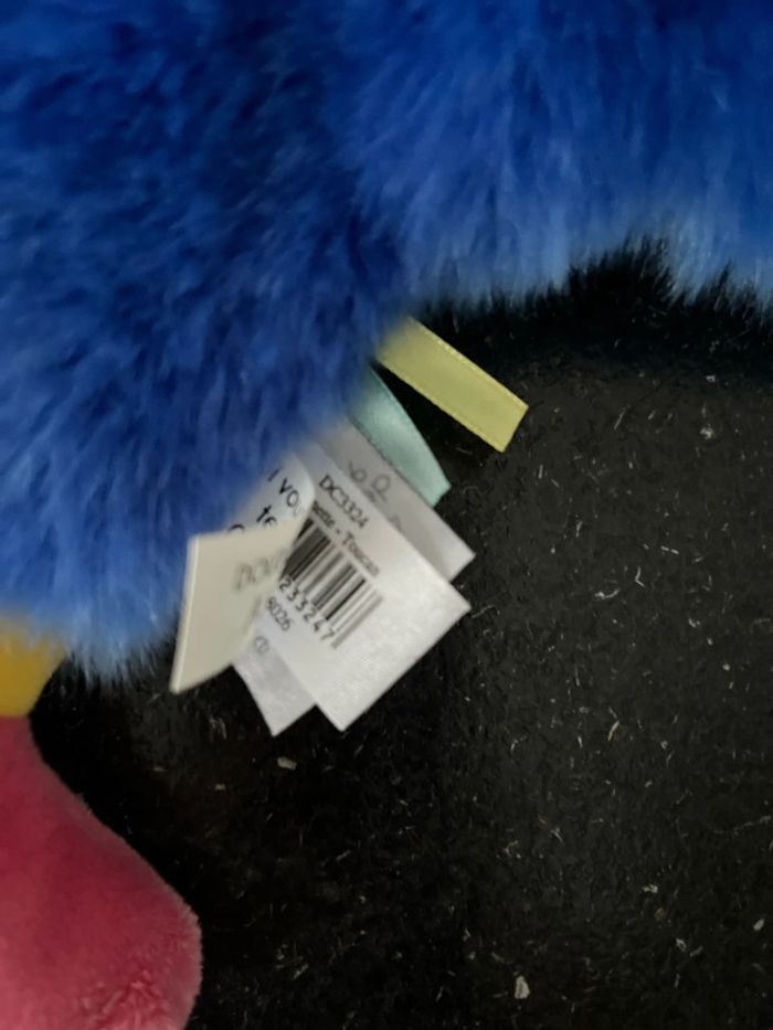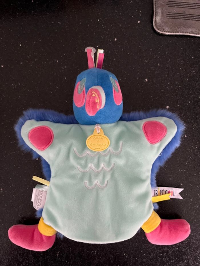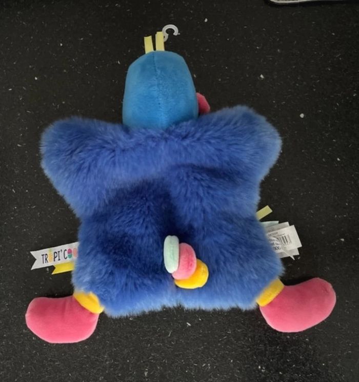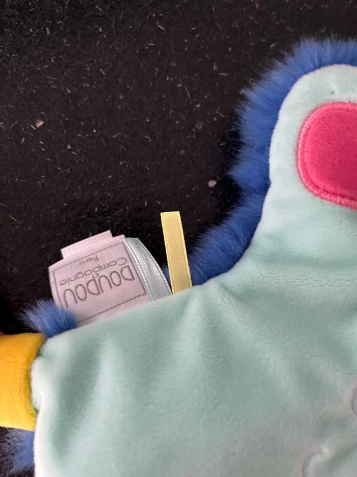Mon prix est fixe merci je vous propose ce magnifique doudou marionnette neuf sans étiquette fourrure bleue velours vert clair pattes rose et jaune doudou jamais utilisé jamais lavé encore attache plastique au sommet de la tête