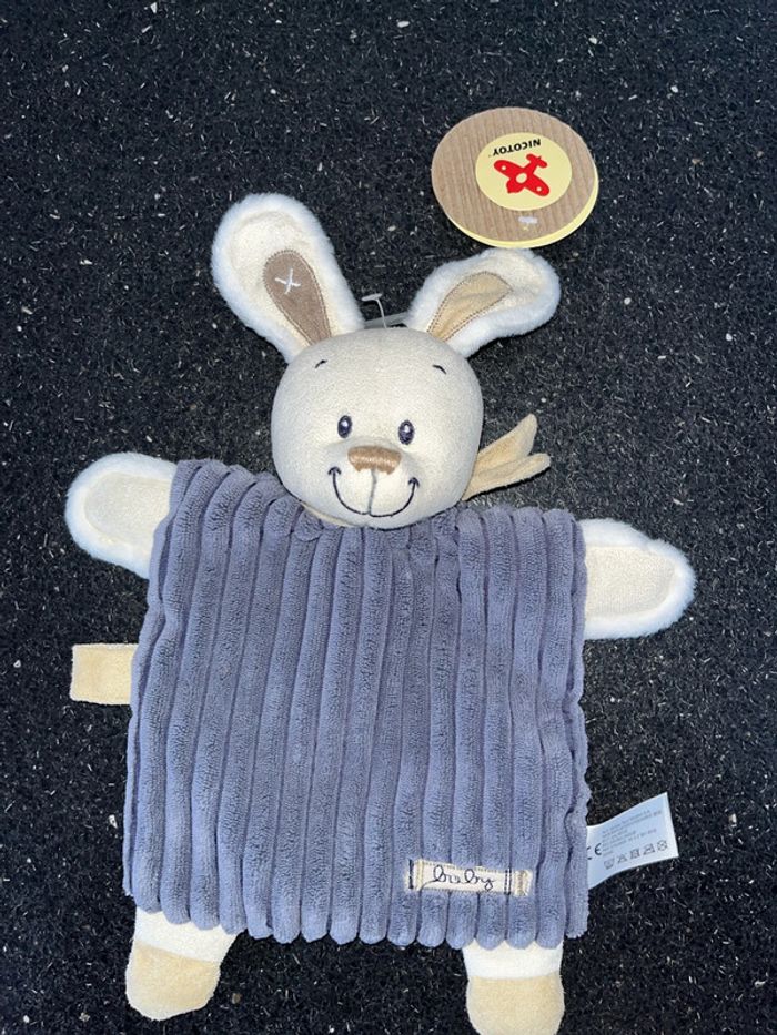 Article neuf encore avec étiquette, quatre petits bouts de pattes beige blanc, corps velours côtelé bleu baby écharpe autour du cou. Nicotoy attache tétine sur le côté.