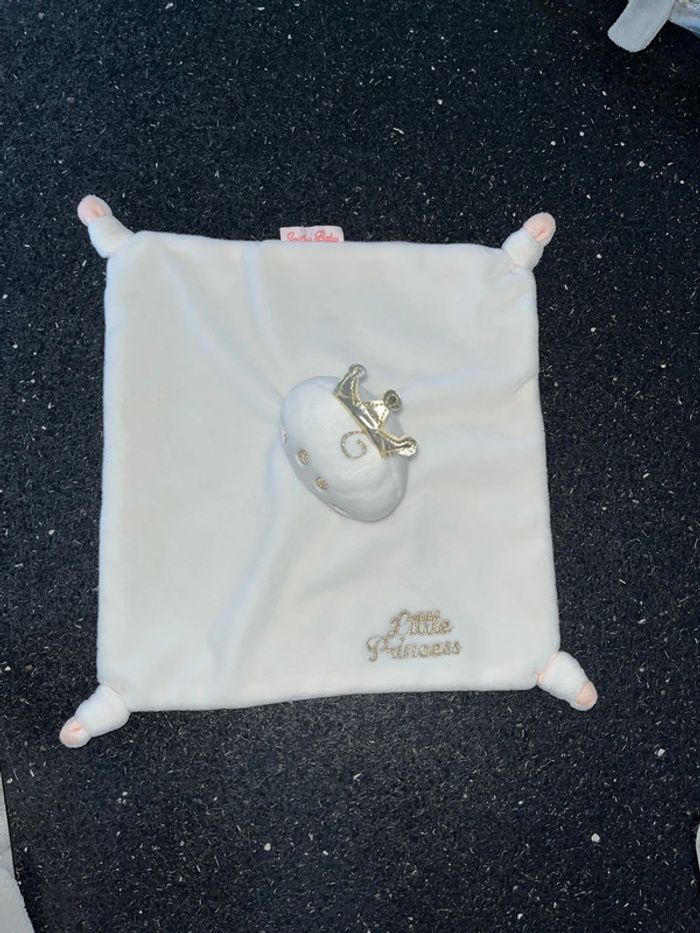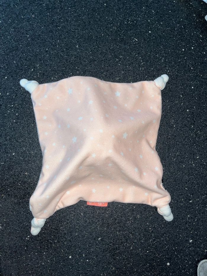 Je vous propose ce très beau doudou, plat, style mouchoir carré velours blanc pour le dessus rose. pour le dessous, imprimé étoiles quatre nœuds tête peluche au centre avec couronne dorée, les yeux la bouche sont brodés smiley baby Little princess orchestra article jamais utilisé. Excellent état.