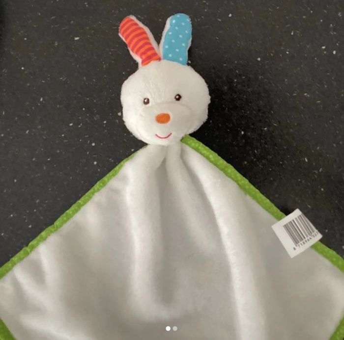 Doudou lapin blanc vert bleu orange violet rayé action plat losange carré grelot hochet