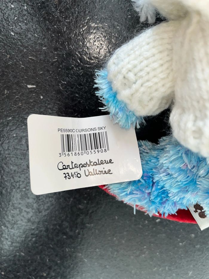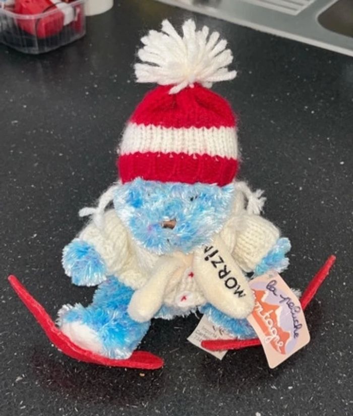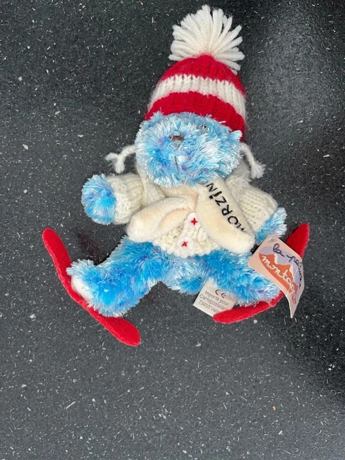 Je vous propose cette peluche ours bleu environ 16 cm de hauteur sans compter le pompon. C’est un ours bleu avec microbilles dans les fesses. L’objet est neuf encore avec étiquette des skis au pied rouge, gilet avec capuche laine, beige, tricot, pull, bonnet rayé, rouge et beige. Cache-nez brodé Morzine Les sports d’hiver
