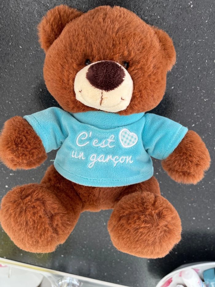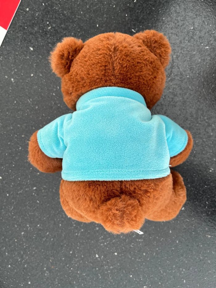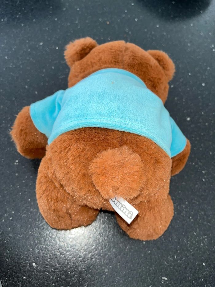 Doudou peluche, ours, assis fourrure, marron T-shirt bleu - photo numéro 1