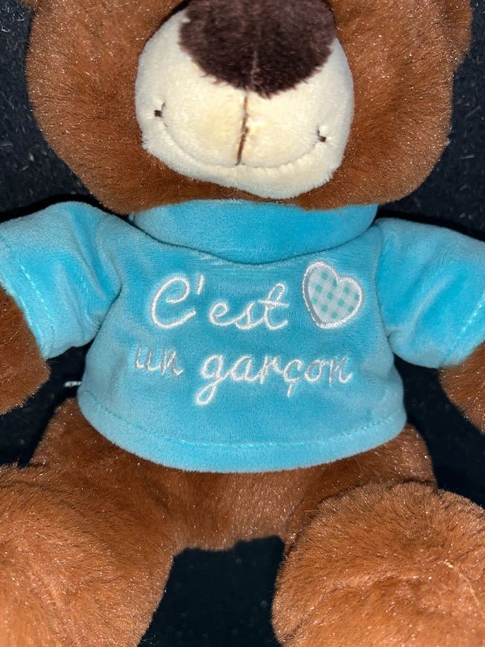 Doudou peluche, ours, assis fourrure, marron T-shirt bleu - photo numéro 4