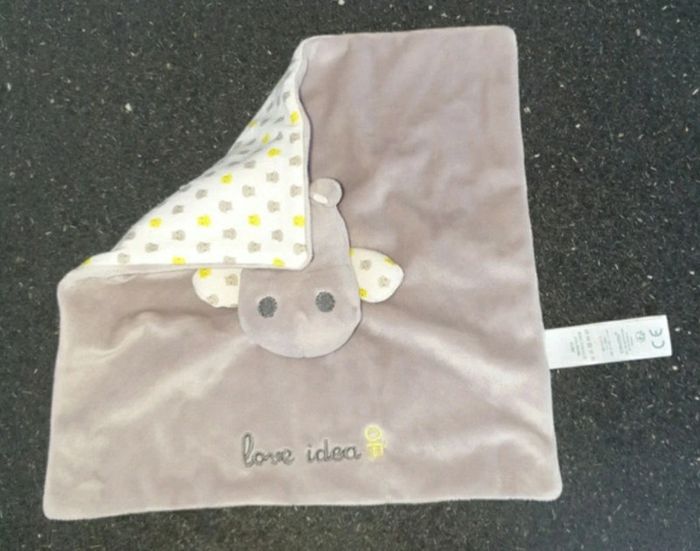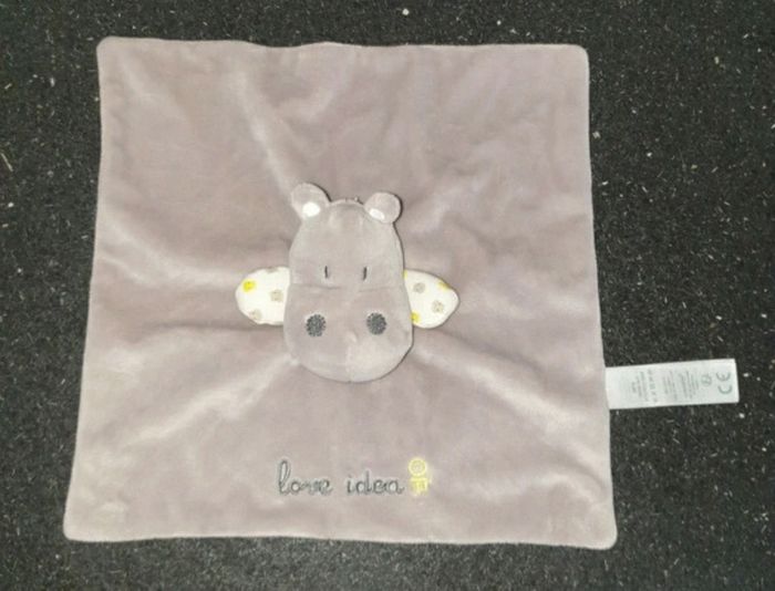 Prix fixe je ne réponds pas aux offres merci Je vous propose ce doudou velours gris plat carré Desous tissu imprimé tête hippopotame gris jaune blanc petit trou pour mettre le doigt et faire marionnette brodé love idea obaïbi OB