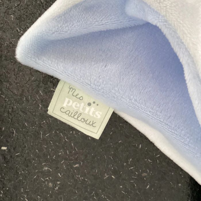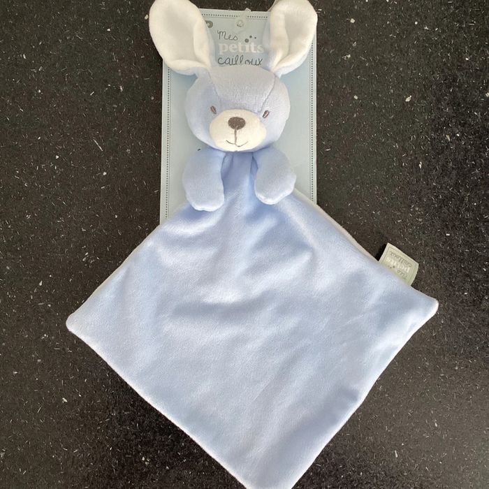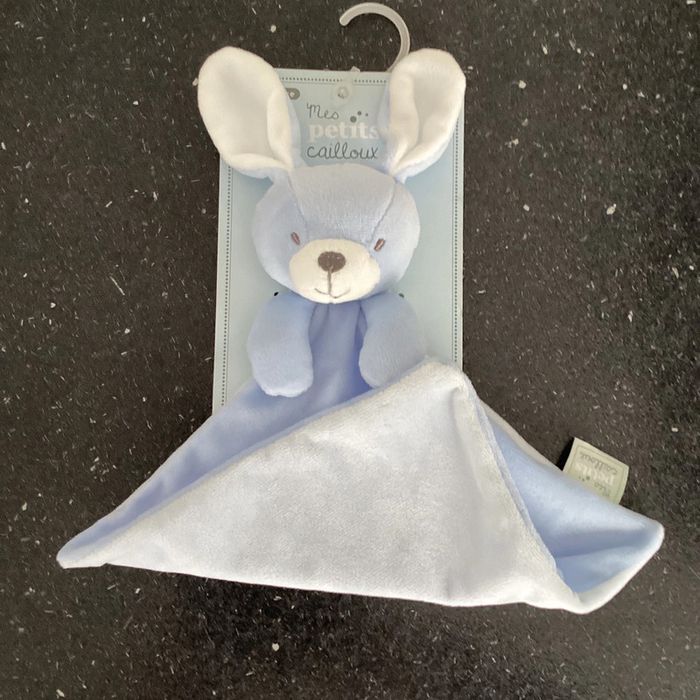 Merci de respecter mon prix Réduction activée sur les lots Doudou neuf sur son carton d’origine forme losange, carré velours, bleu ciel blanc, tête, peluche lapin, 2 pattes bras marque mes petits cailloux