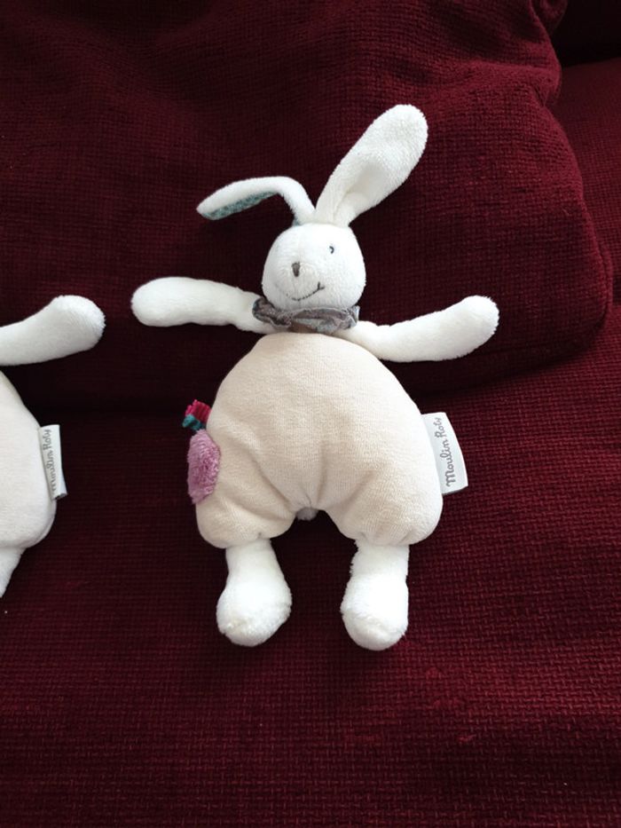 Petite peluche doudou environ 20 cm de hauteur sans compter les oreilles de la marque Moulin Roty Lapin en velours couleur beige blanc un peu de rose parme sur le côté il fait hochet grelot également très très bon état Stocké dans une maison sans animaux et non-fumeurs