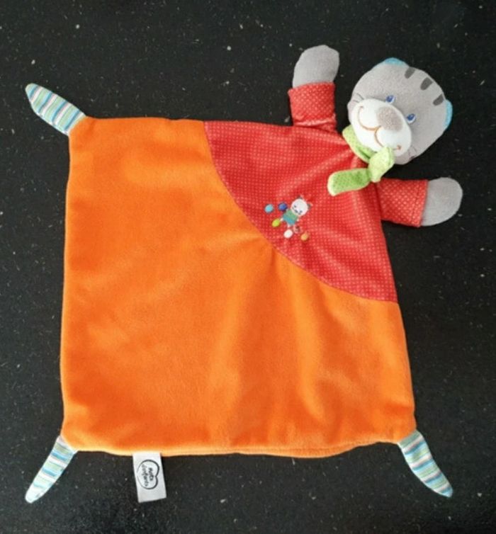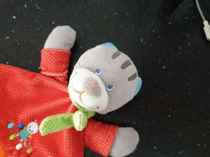Mon prix n'est pas négociable je vous propose ce doudou tigre chat velours gris blanc corps plastil mouchoir velours orange rouge Bleu une balle un ballon