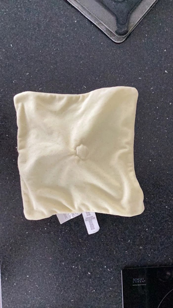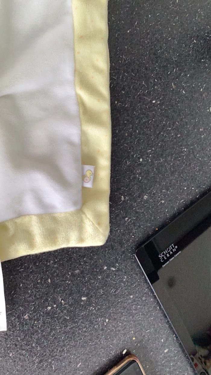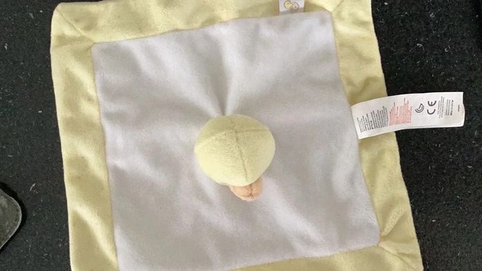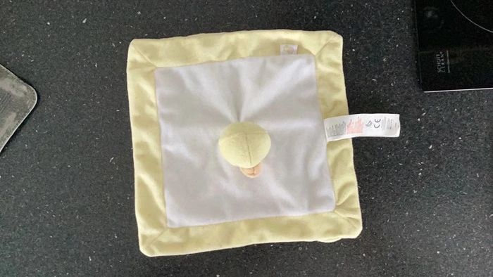 État neuf pour ce doudou plat style mouchoir velours jaune pour le dessous, le dessus velours blanc avec un tour jaune tête peluche canard poussin avec bec orange. Les yeux sont brodés gris