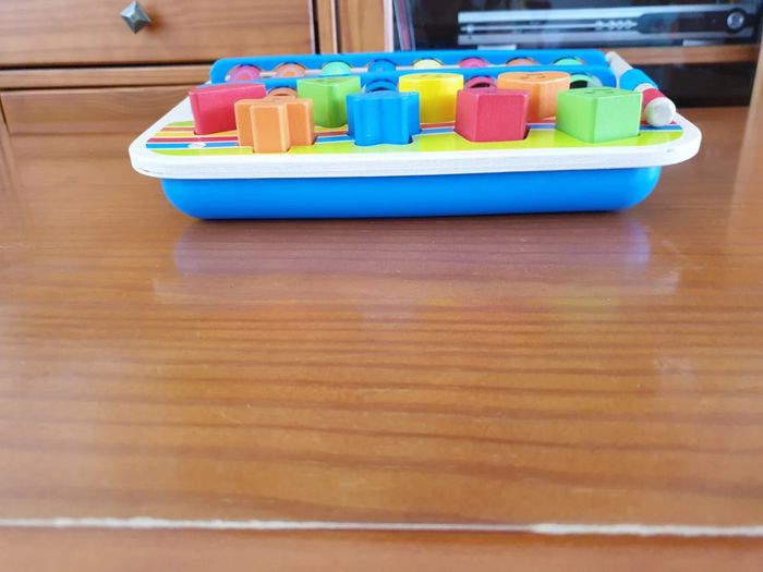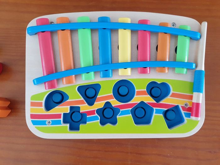 Petit pupitre avec xylophone et petite baguette en plus 8 formes sur lesquels on peut appuyer pour faire de la musique très coloré rouge vert jaune orange bleu les différentes formes pour apprendre carré cœur rond triangle croix étoile ...