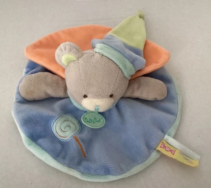 Je vous propose, doudou, ours, bonnet peluche bleu, orange, vert, rond, sucette bonbon plat de la marque baby Nat en très bon état