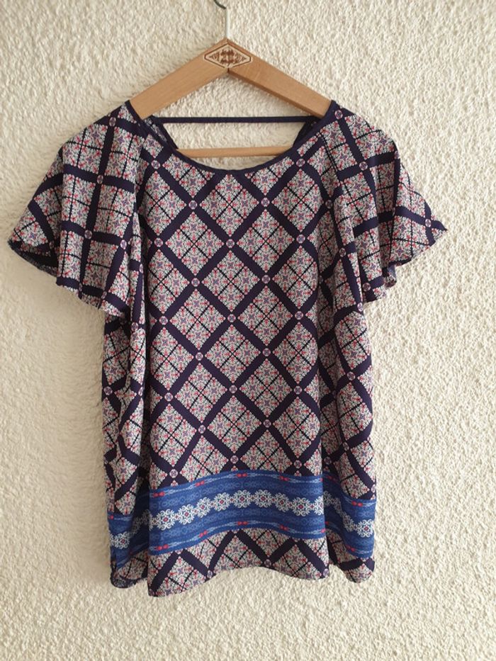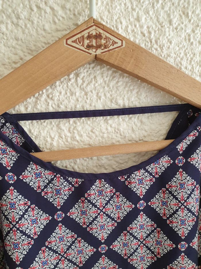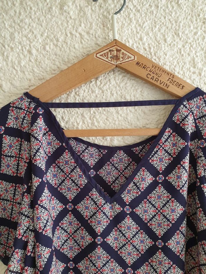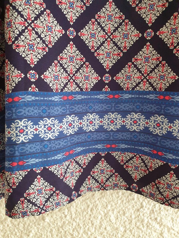 Bleu marine blanc motifs géométriques Petite fente sur le côté dans le bas Col en V dans le dos Voir photos Tissu viscose polyester Hauteur total 66 cm Base 58 cm Idem D'aisselle à aisselle