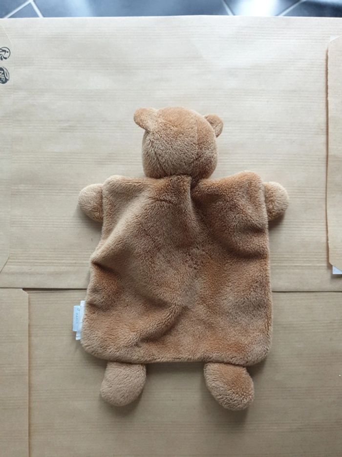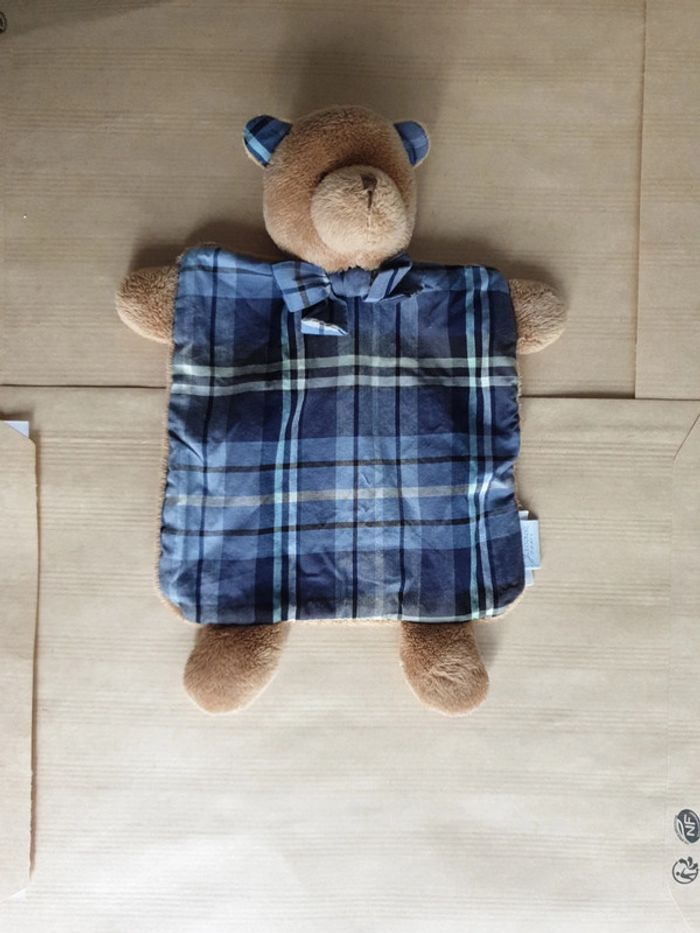 Mon abécédaire ours velours marron clair sur une face l'autre face tissu carreaux bleu Doudou plat style mouchoir