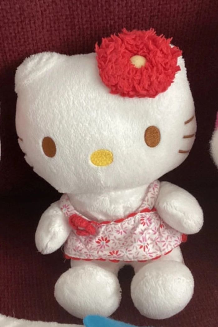 Prix non négociable merci Réduction activée pour les lots Je vous propose ce doudou peluche hello kitty avec sa petite robe blanche rouge fleurs feuillage