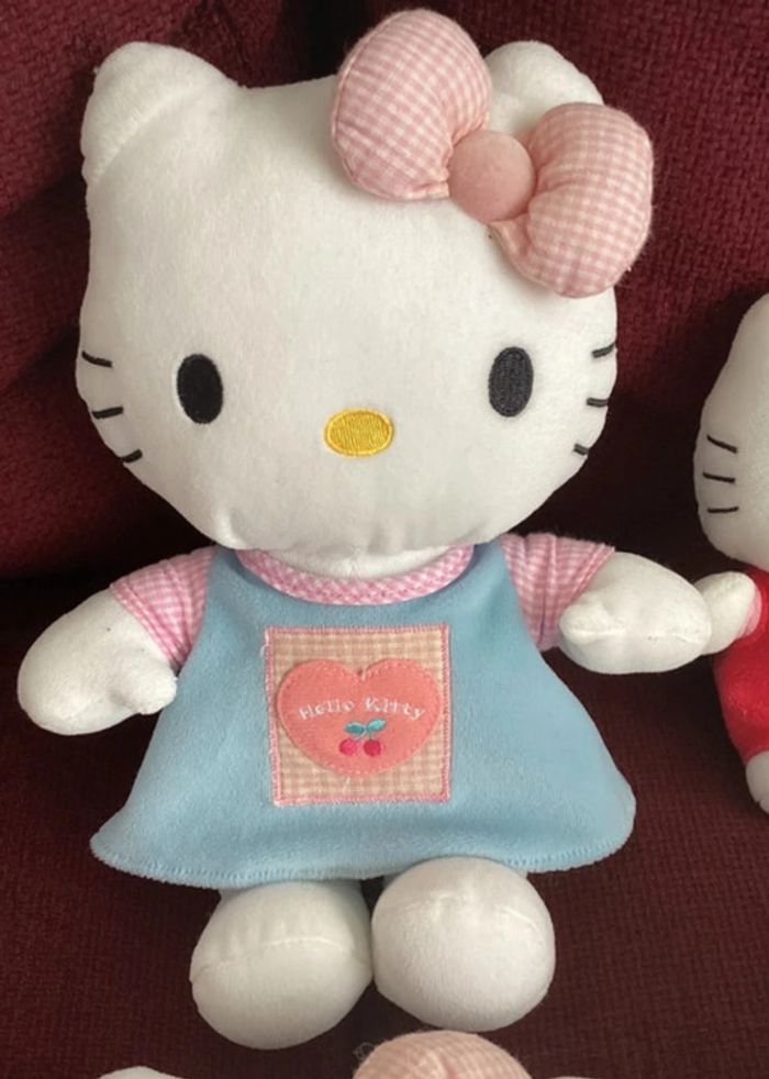 Prix fixe, réduction activée pour les lots. Je vous propose cette peluche hello kitty blanc, rose bleu, robe velours cœur cerise, vichy rose et blanc Une bonne vingtaine de centimètres assise
